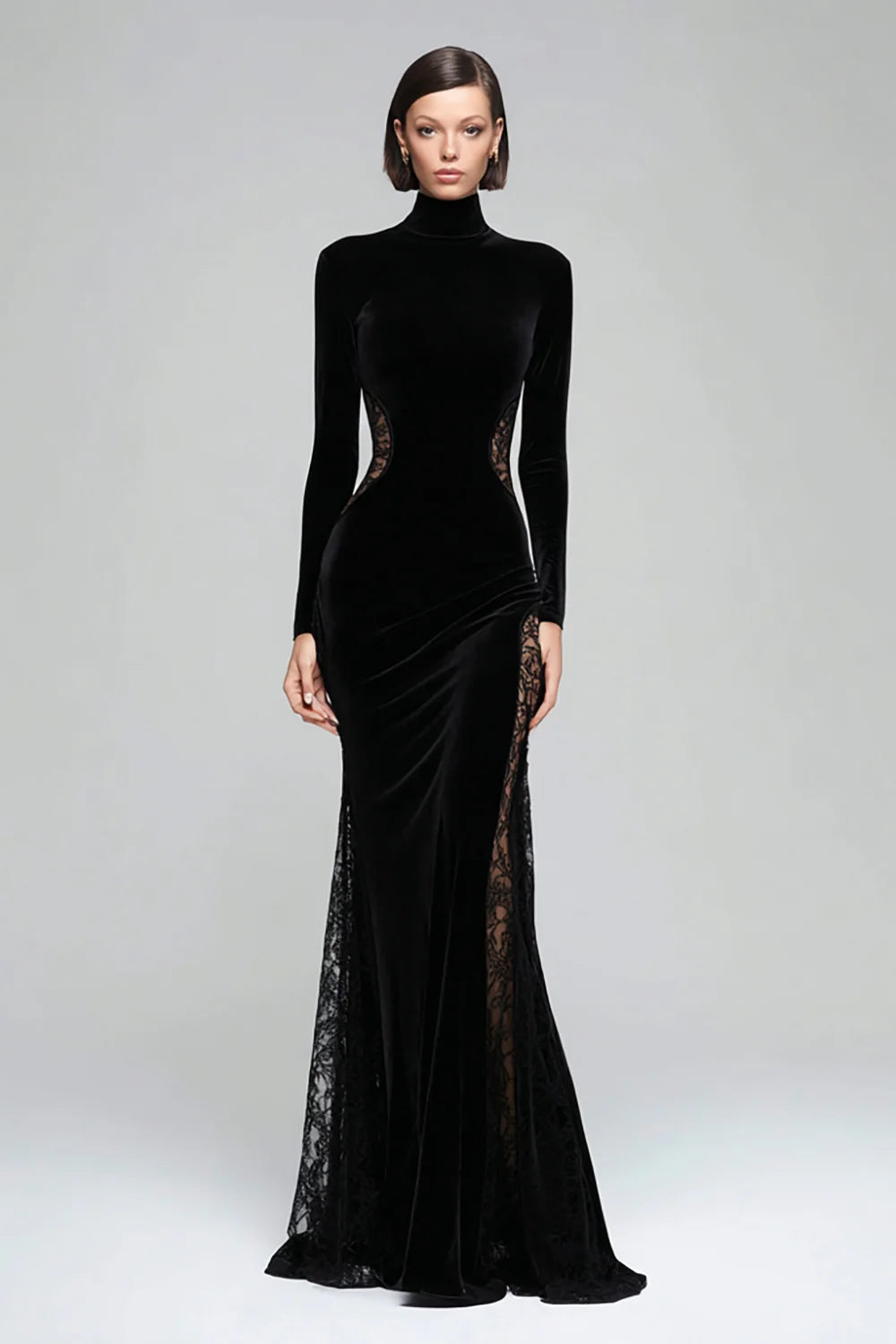 Mermaid Velvet High Neck Black Tie Dress With Lace