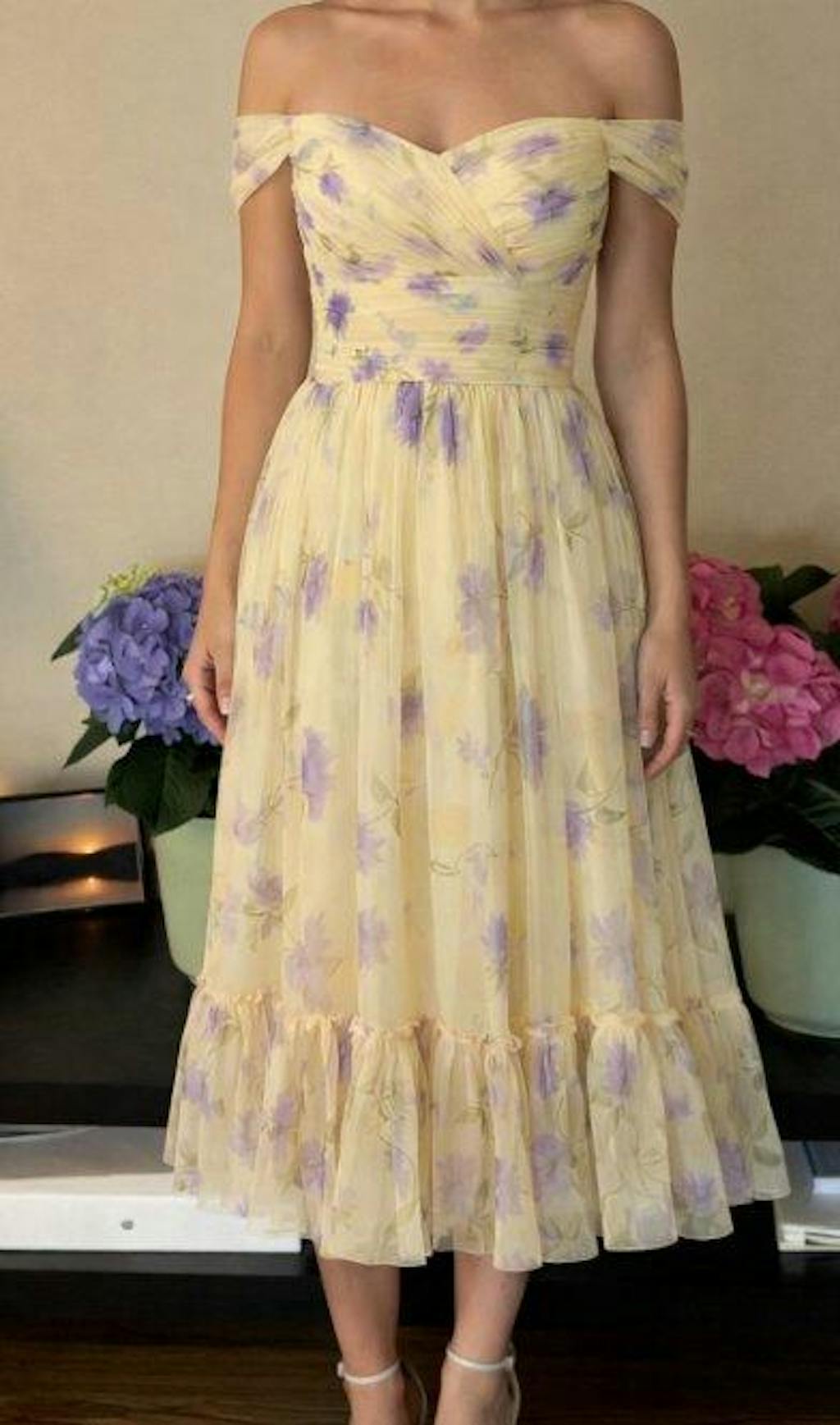 Yellow Floral Off the Shoulder A Line Wedding Guest Dress