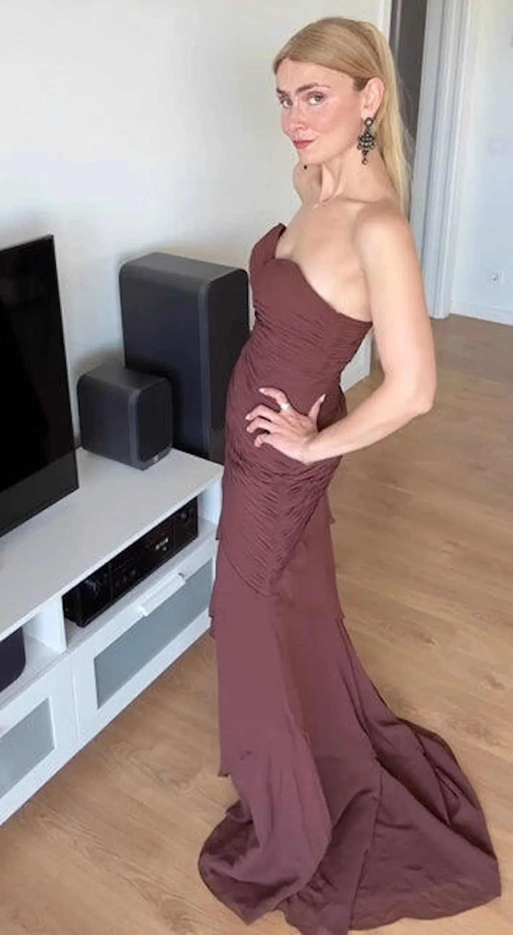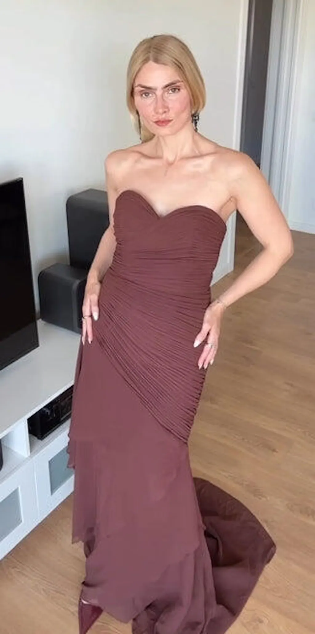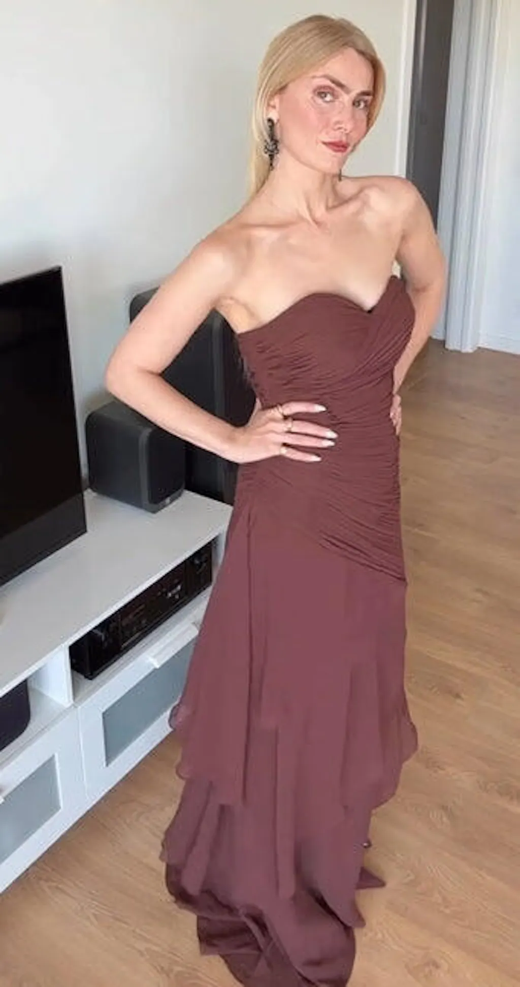 I was nervous about ordering a dark brown dress online, but this one exceeded expectations. The color is rich and sophisticated—not flat or muddy at all. The ruched detailing adds dimension and helps hide any lumps, while still showing off curves in the best way. I felt confident, sexy, and completely polished.