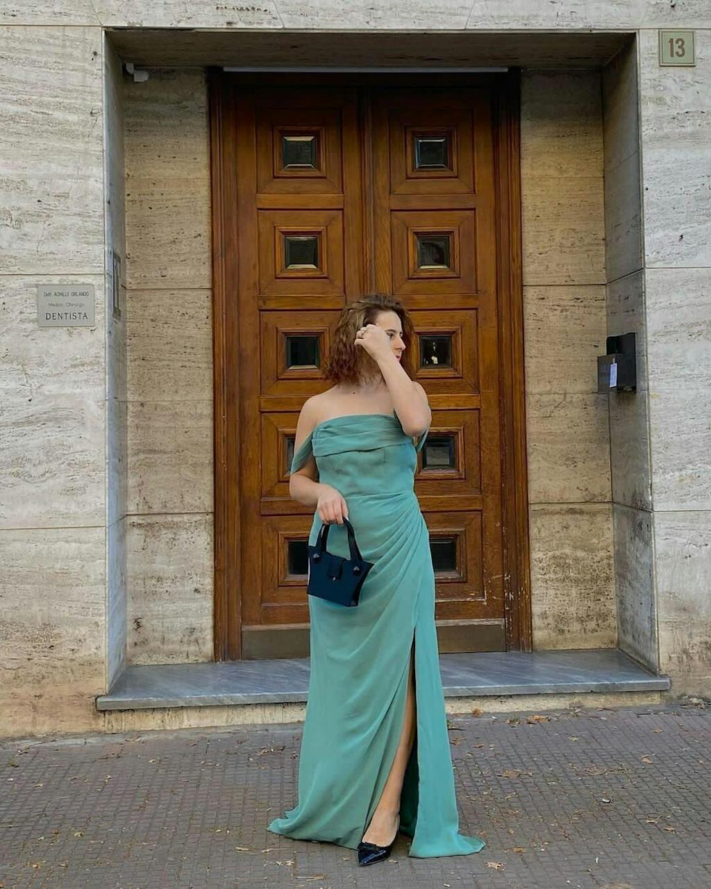 Dusty Sage Off the Shoulder Sheath Chiffon Pleated Maxi Dress with Slit