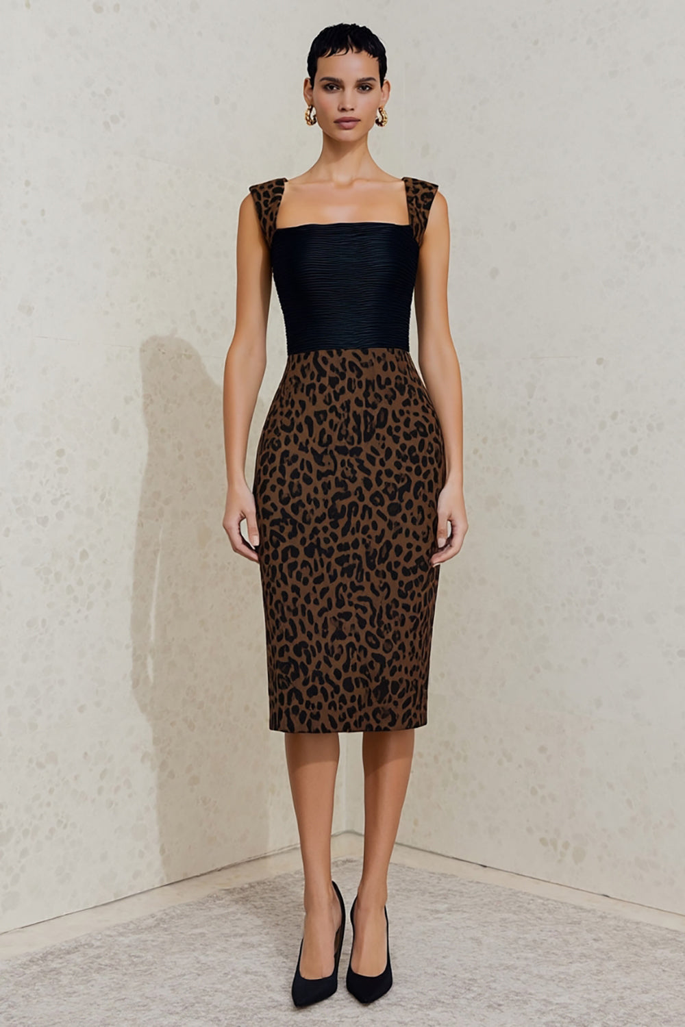 Black and Brown Leopard Bodycon Midi Work Dress