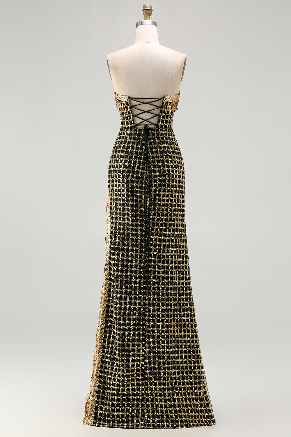 Strapless Black Golden Sequin Pearl Prom Dress With Slit