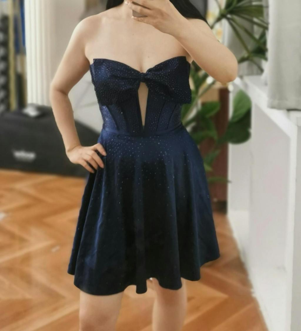 Sparkly Navy Beaded Corset Hollow Out Mini Dress With Bow