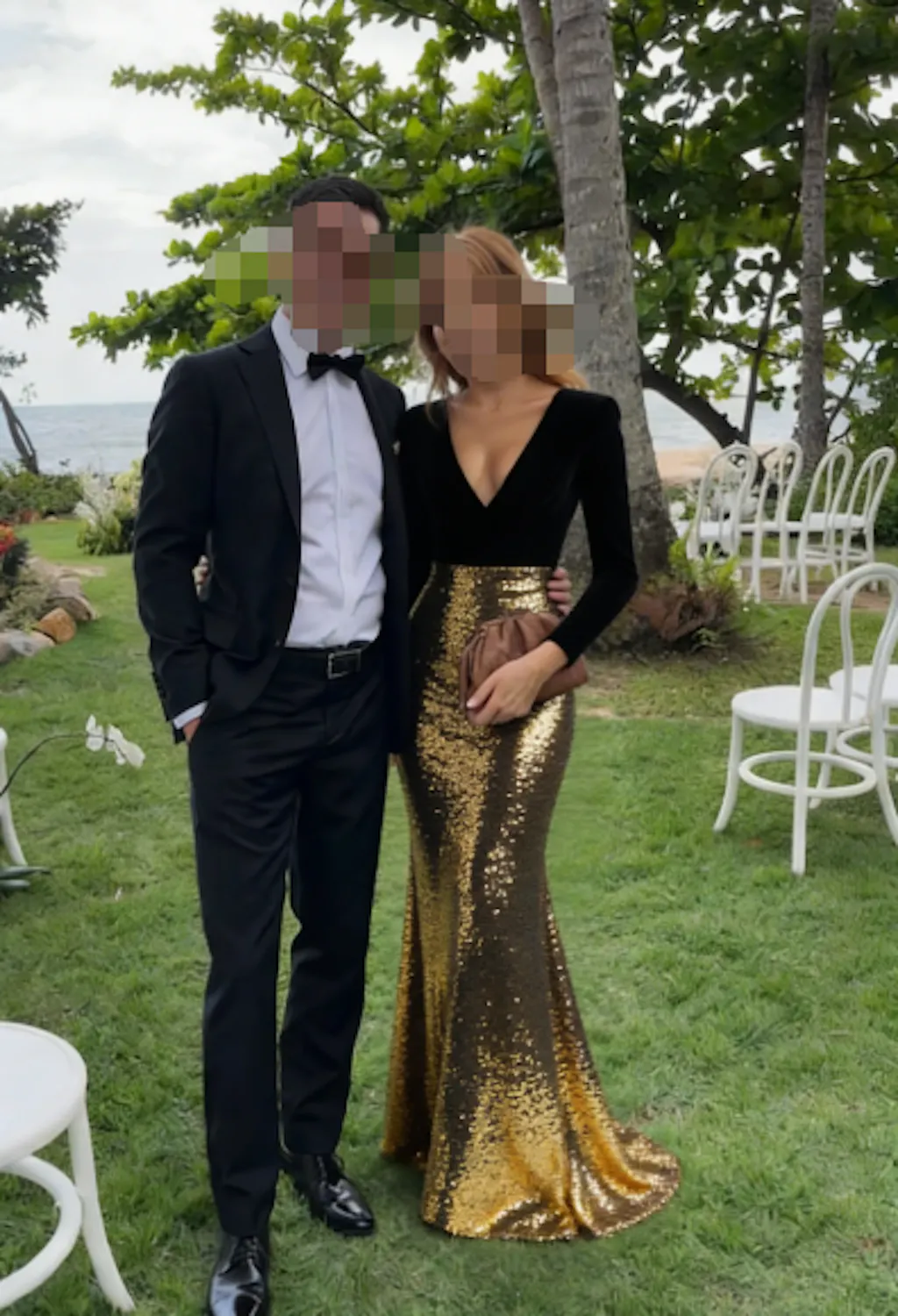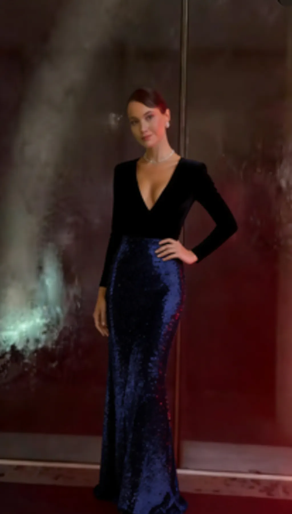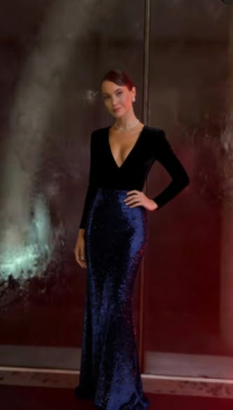 Sparkly Gold and Black Velvet Long Sleeve V-Neck Formal Dress