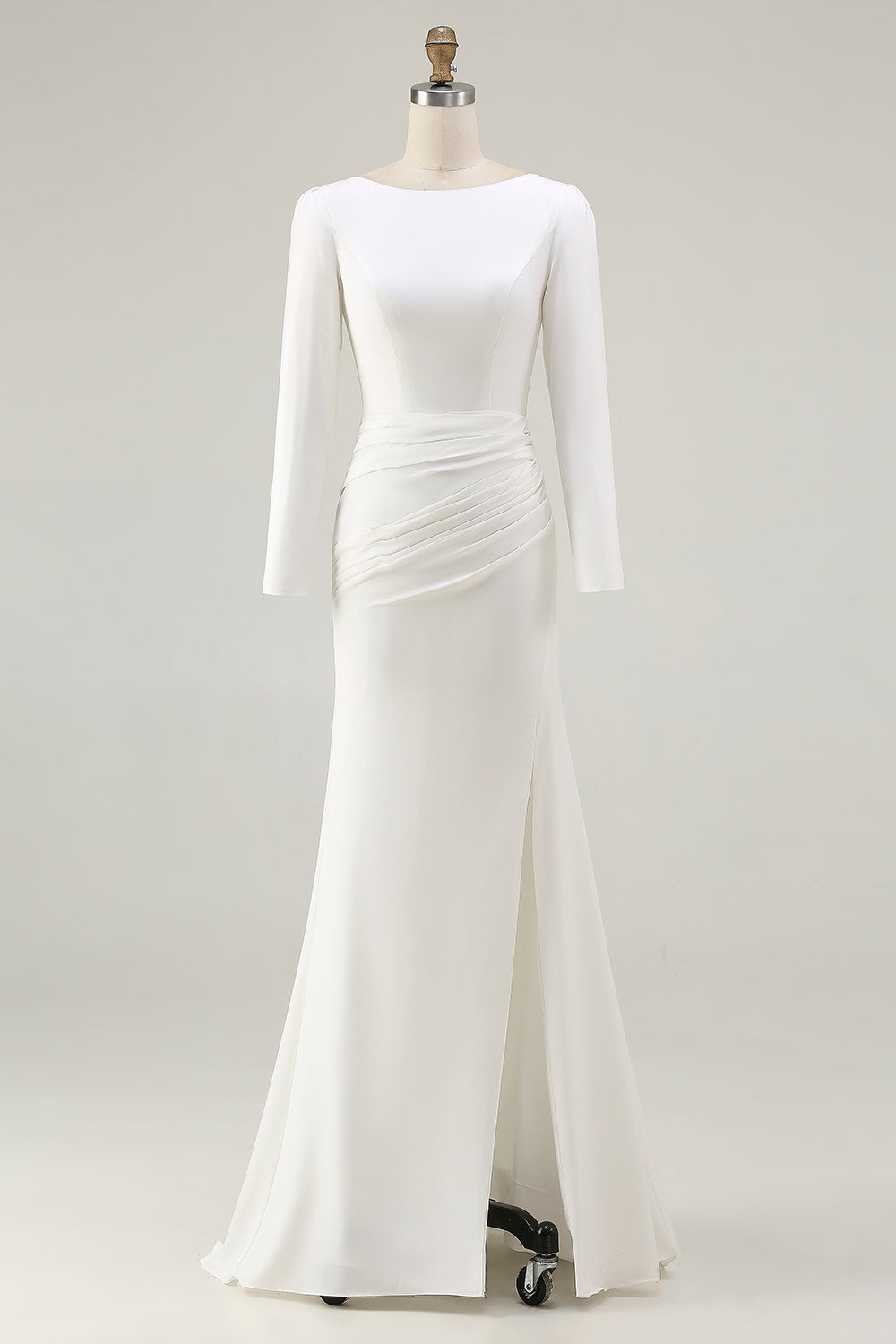 Ivory Ruched Long Sleeve Wedding Dress With Slit