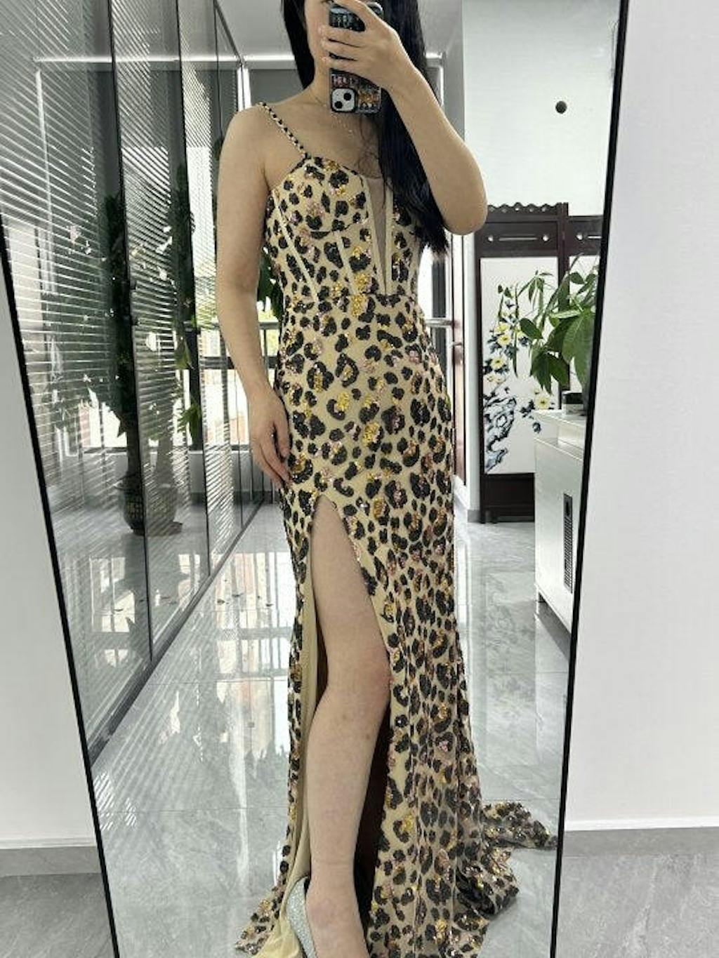 Khaki Leopard Sequins Mermaid Spaghetti Straps Long Corset Dress with Slit