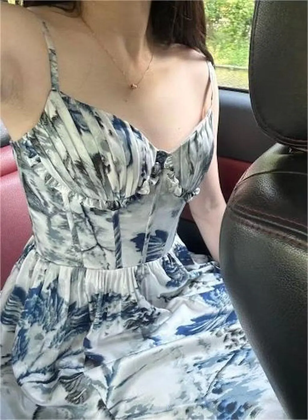 A Line Pleated Blue Printed Corset Maxi Dress with Slit