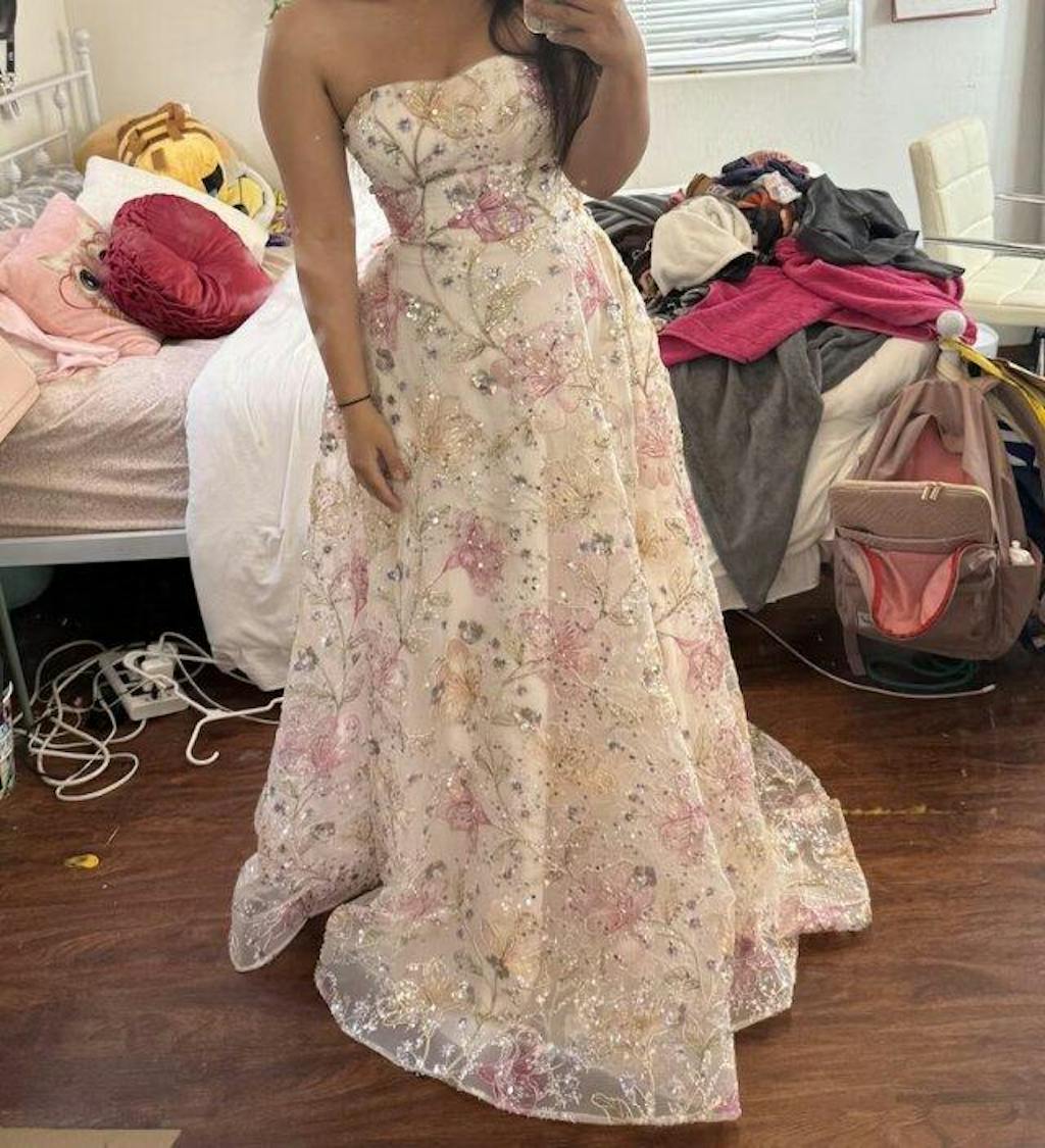 Sparkly Pink A-Line Strapless Sequin Floral Long Prom Dress
