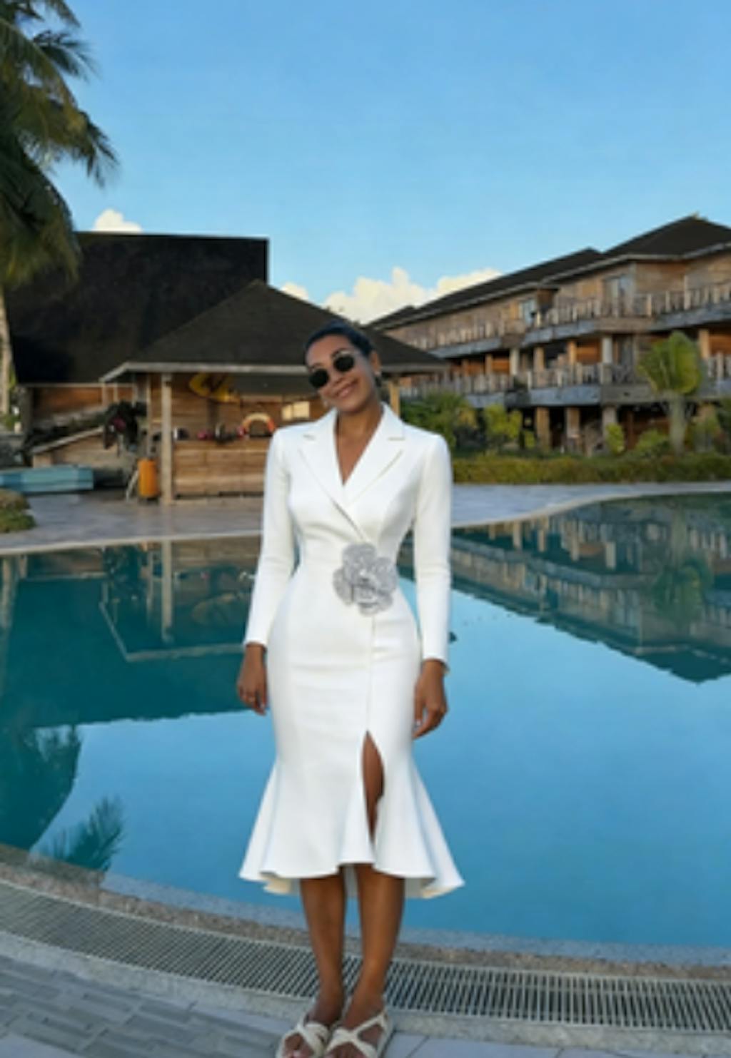 White Mermaid Notched Lapel Midi Work Dress With Slit