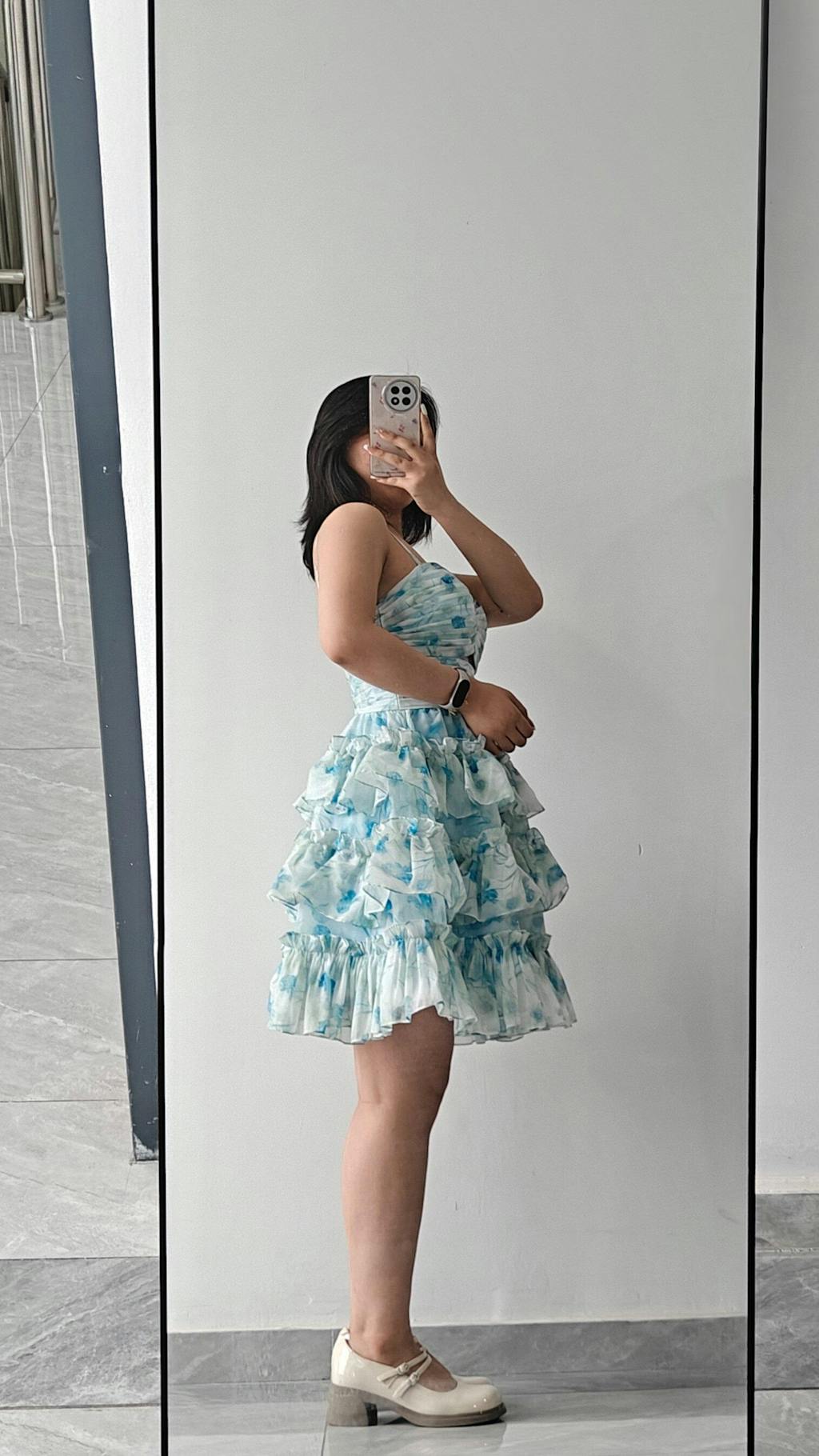 A-Line Spaghetti Straps Tiered Blue Floral Mini Dress