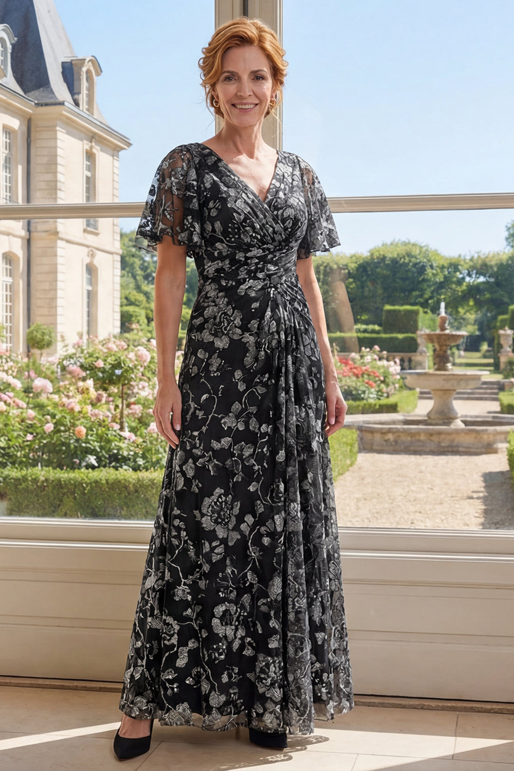 Black Appliqued A Line Ruched Mother of the Bride Dress