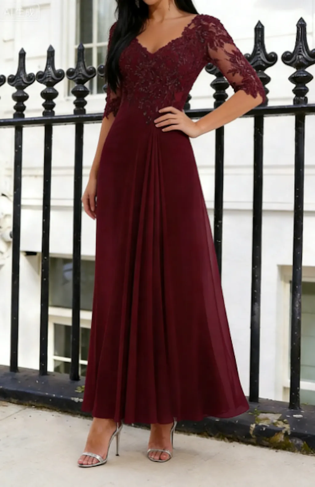 Burgundy Lace Appliqued A Line Chiffon Long Mother Of the Bride Dress