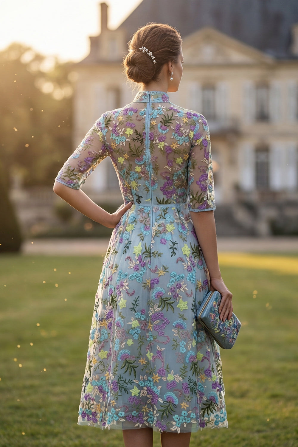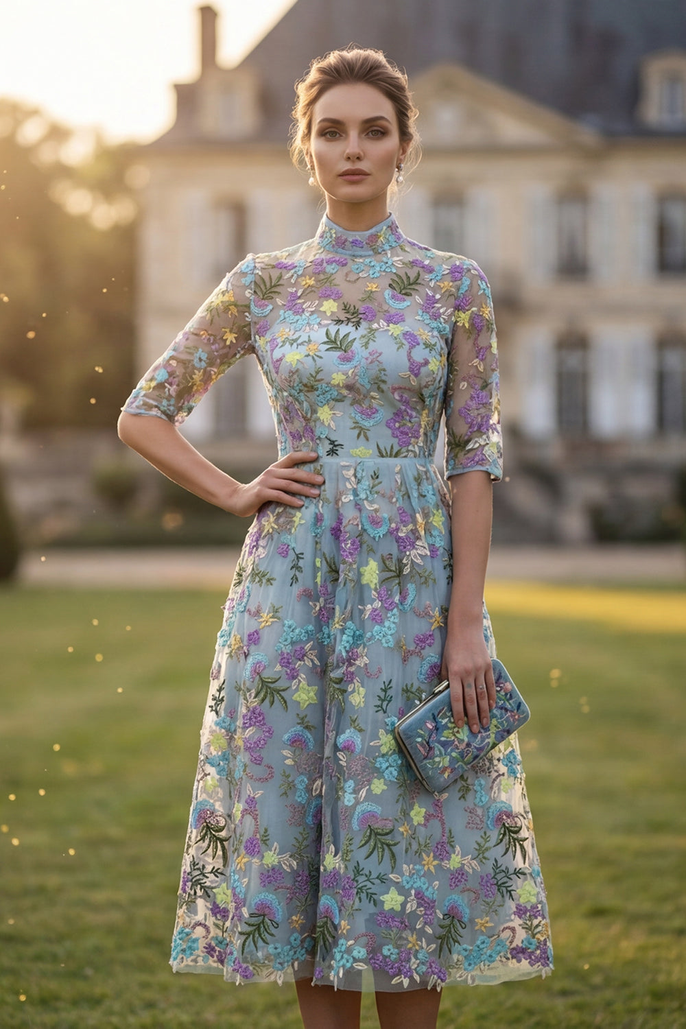 High Neck A Line Blue Floral Embroidered Mother of the Bride Dress