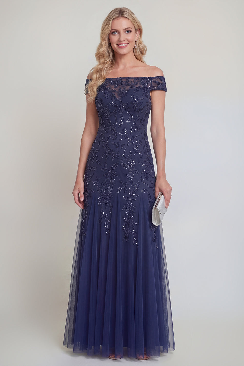 Off the Shoulder A Line Appliqued Navy Mother of the Bride Dress