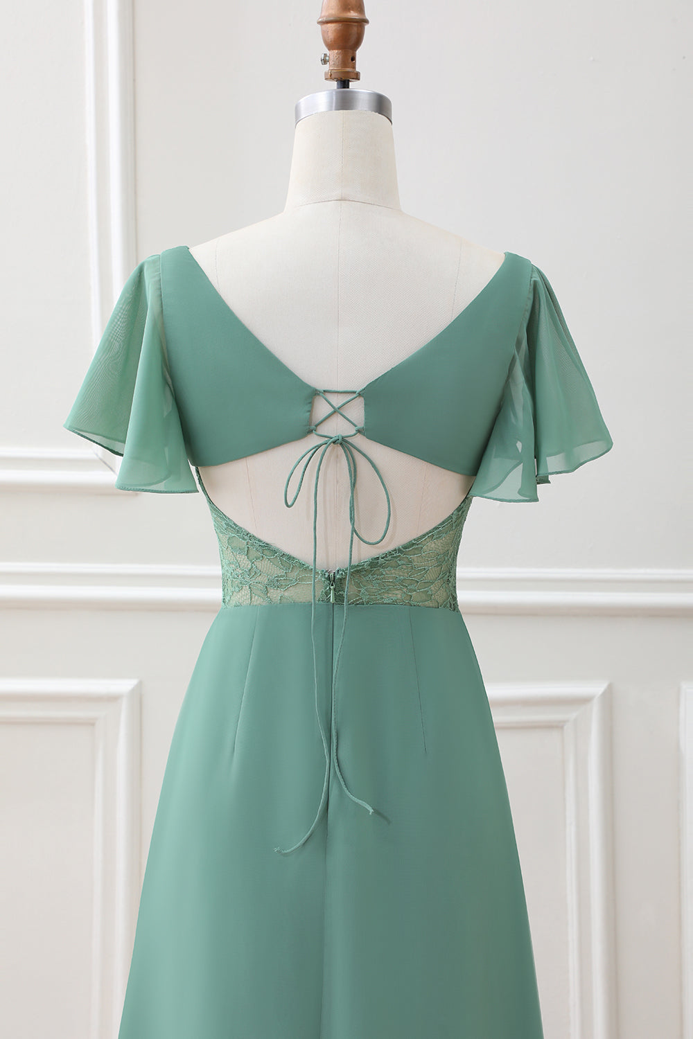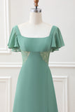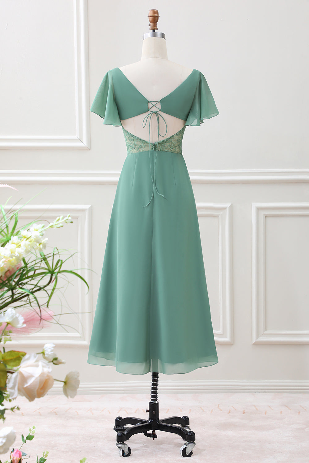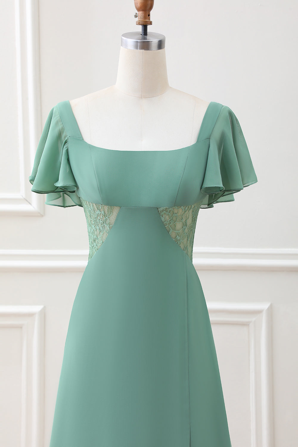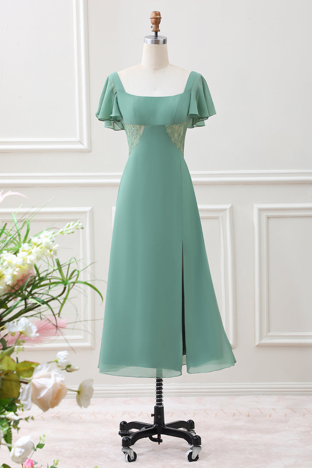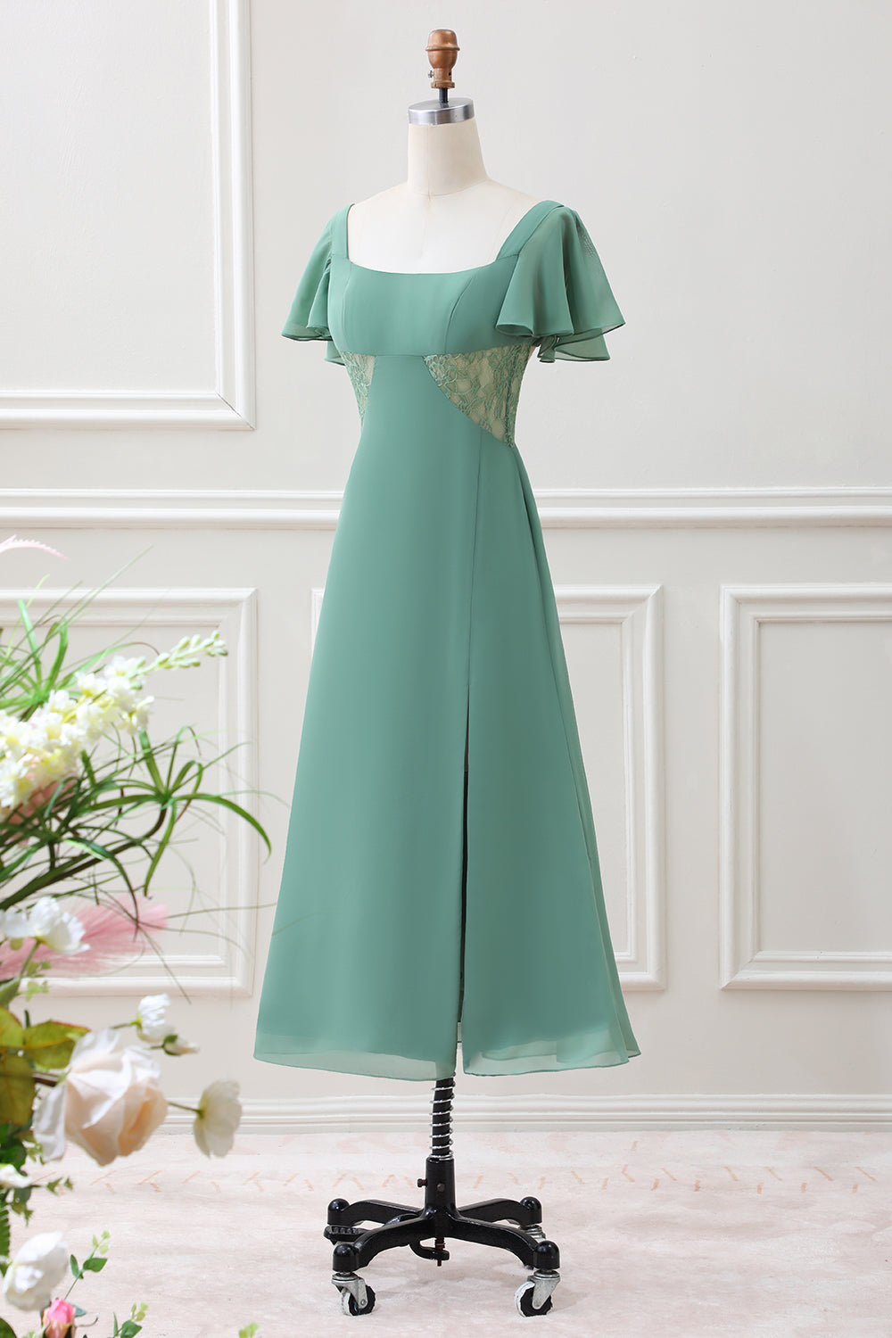 A Line Eucalyptus Square Neck Chiffon Tea-length Dress with Slit