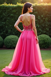 A Line Fuchsia Spaghetti Straps Organza Lace Prom Dress