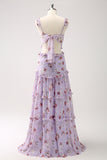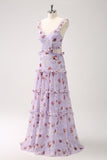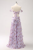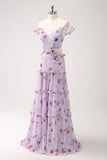 A Line Grey Purple Off the Shoulder Floral Ruffles Cut Out Maxi Dress