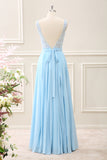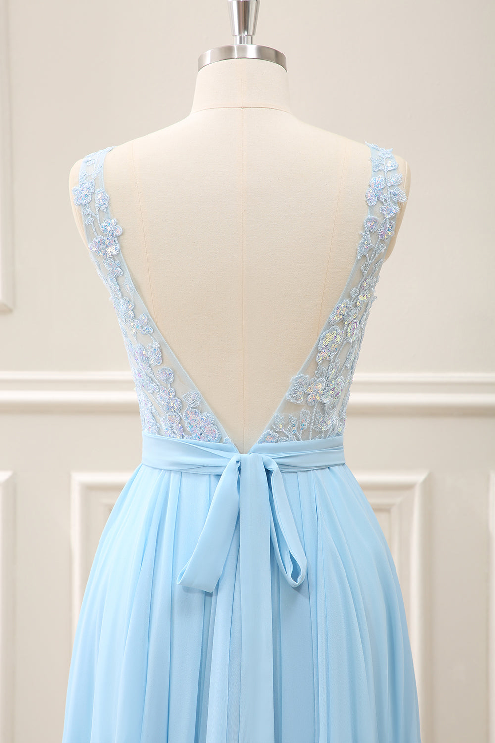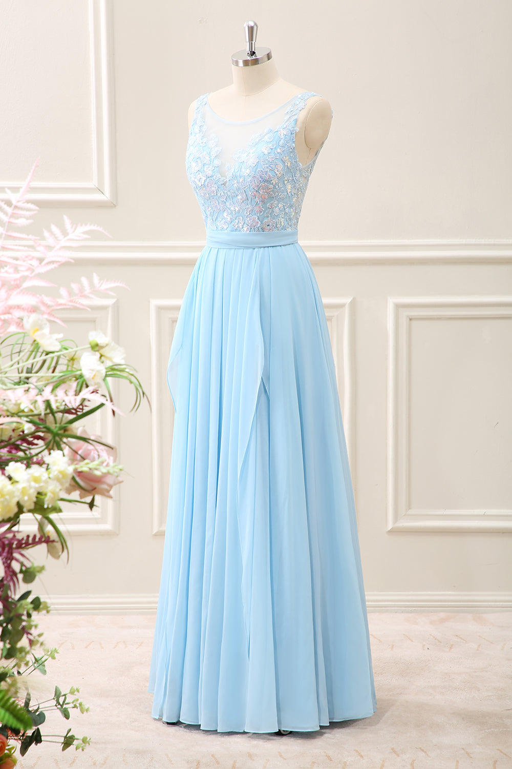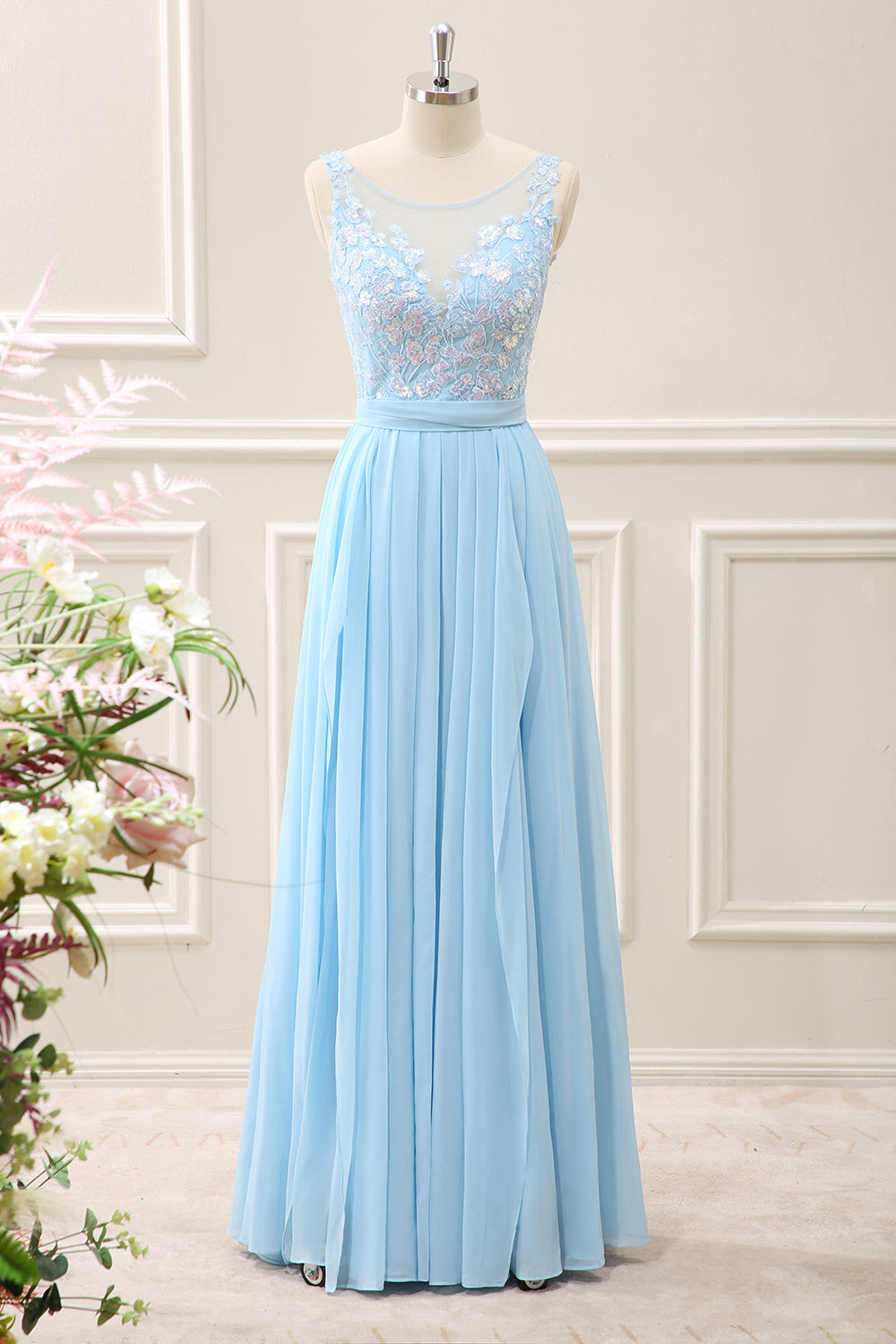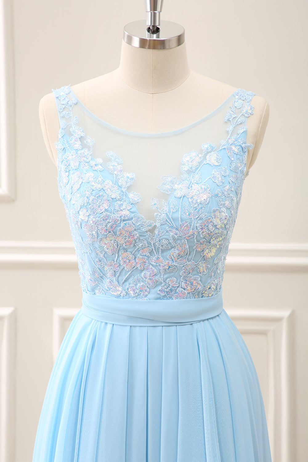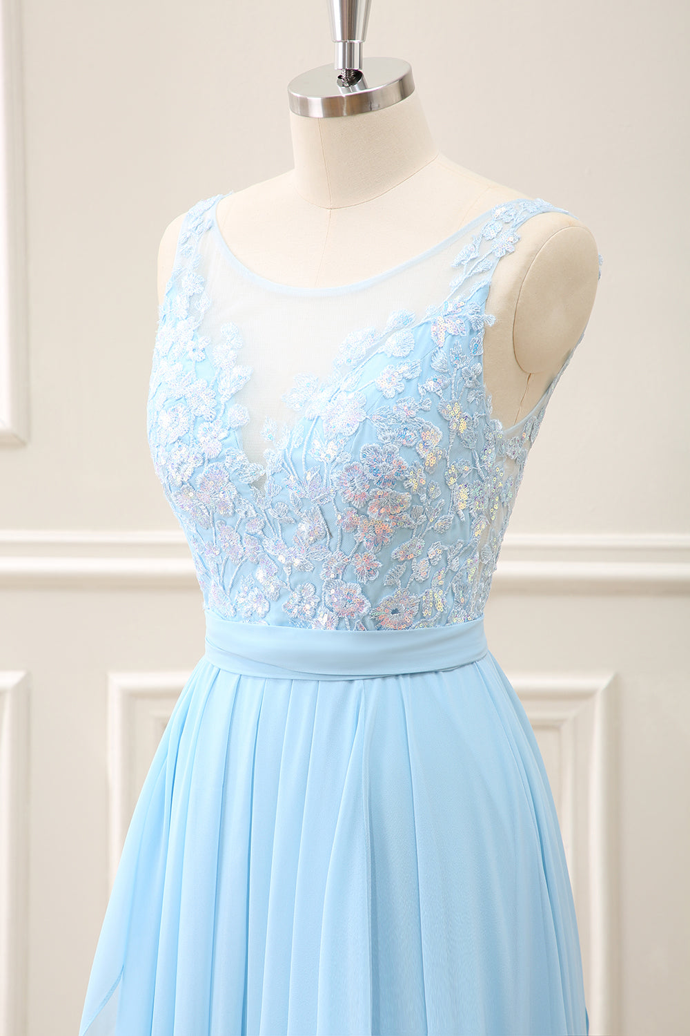 A Line Sky Blue Round Neck Chiffon Ruffled Maxi Dress with Appliques