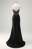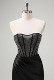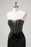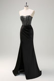 Beaded Black Strapless Ruched Mermaid Prom Dress with Slit