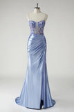 Beaded Blue Satin Ruched Mermaid Prom Dress with Slit
