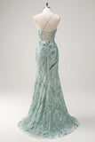 Beaded Mermaid Lace-up Back Sage Prom Dress with Slit