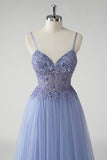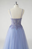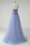 Beaded Tulle A Line Grey Blue Prom Dress with Slit
