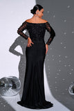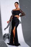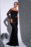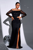 Black Cut Out Mermaid Off the Shoulder Appliques Long Sleeves Maxi Dress with Slit