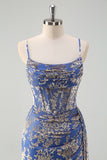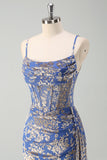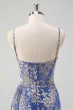 Blue Mermaid Burnout Velvet Corset Prom Dress with Slit