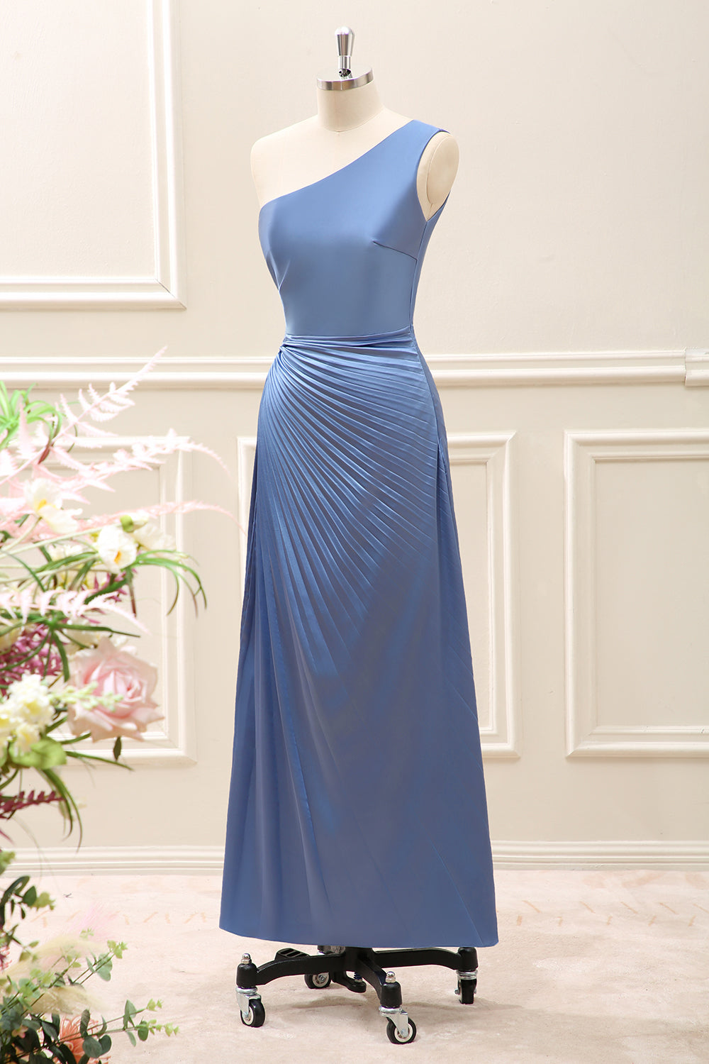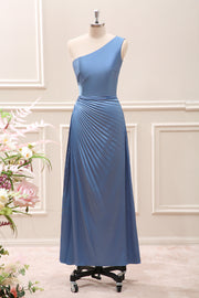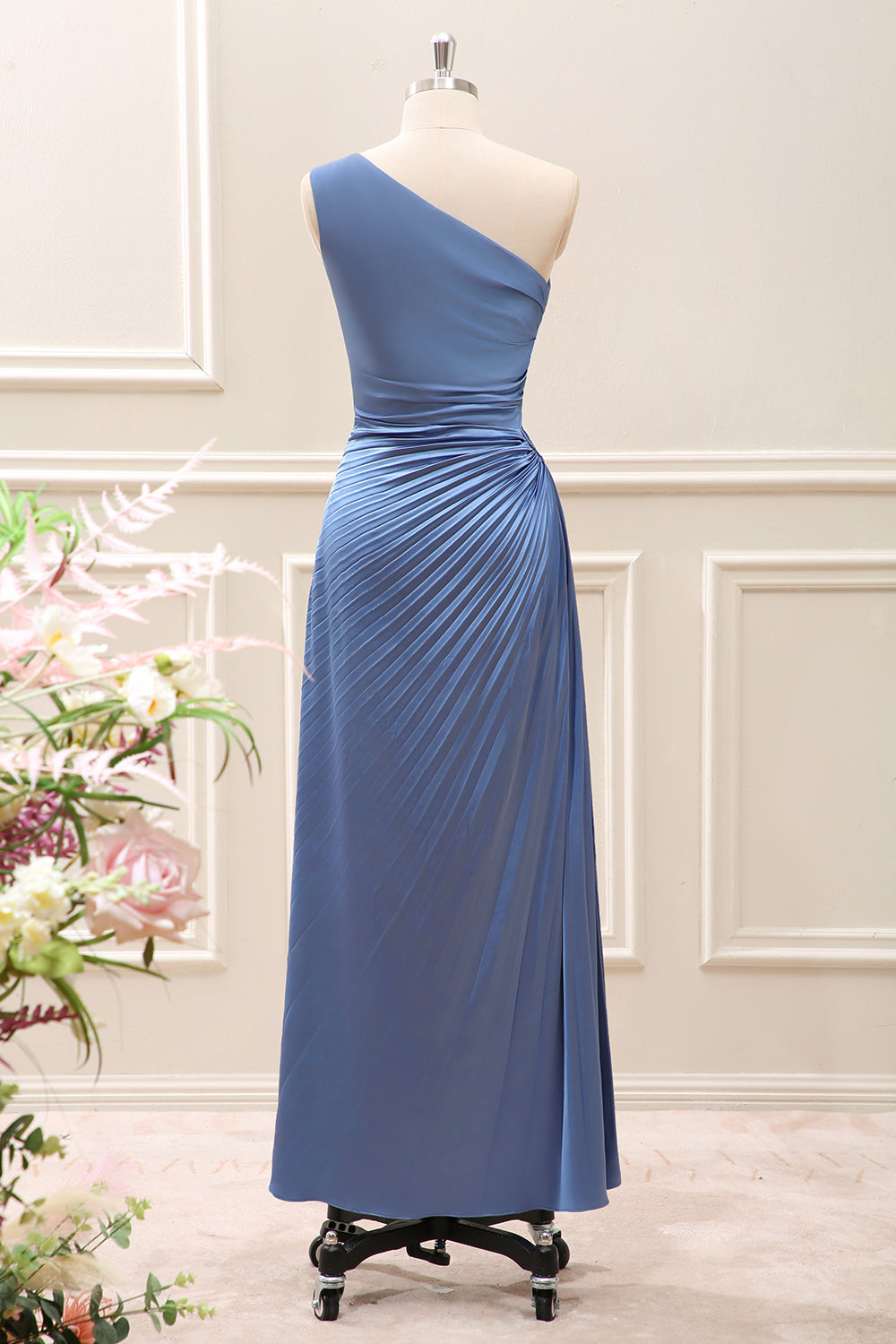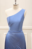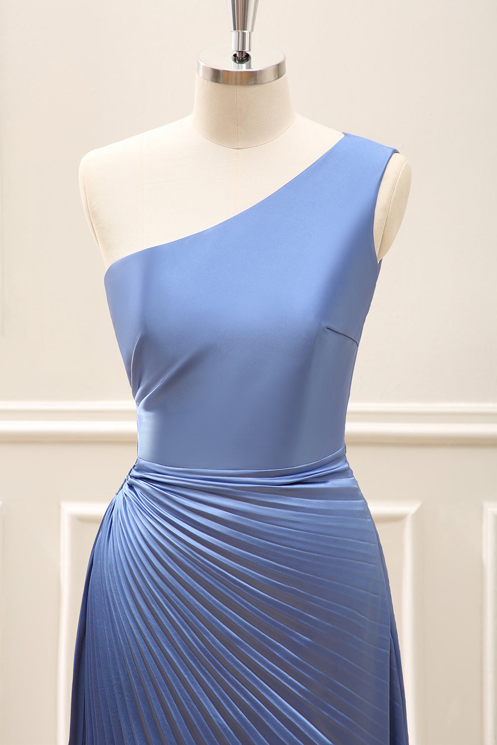 Blue One Shoulder Satin Ruched Tea Length Dress