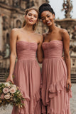 Blush A-Line Ruched Strapless Bridesmaid Dress With Ruffles