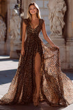 Brown Leopard A-Line Prom Dress With Slit