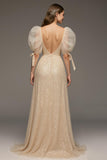 Champagne A-Line Puff Sleeve Maxi Dress with Slit