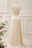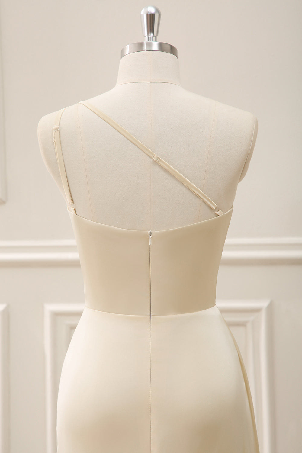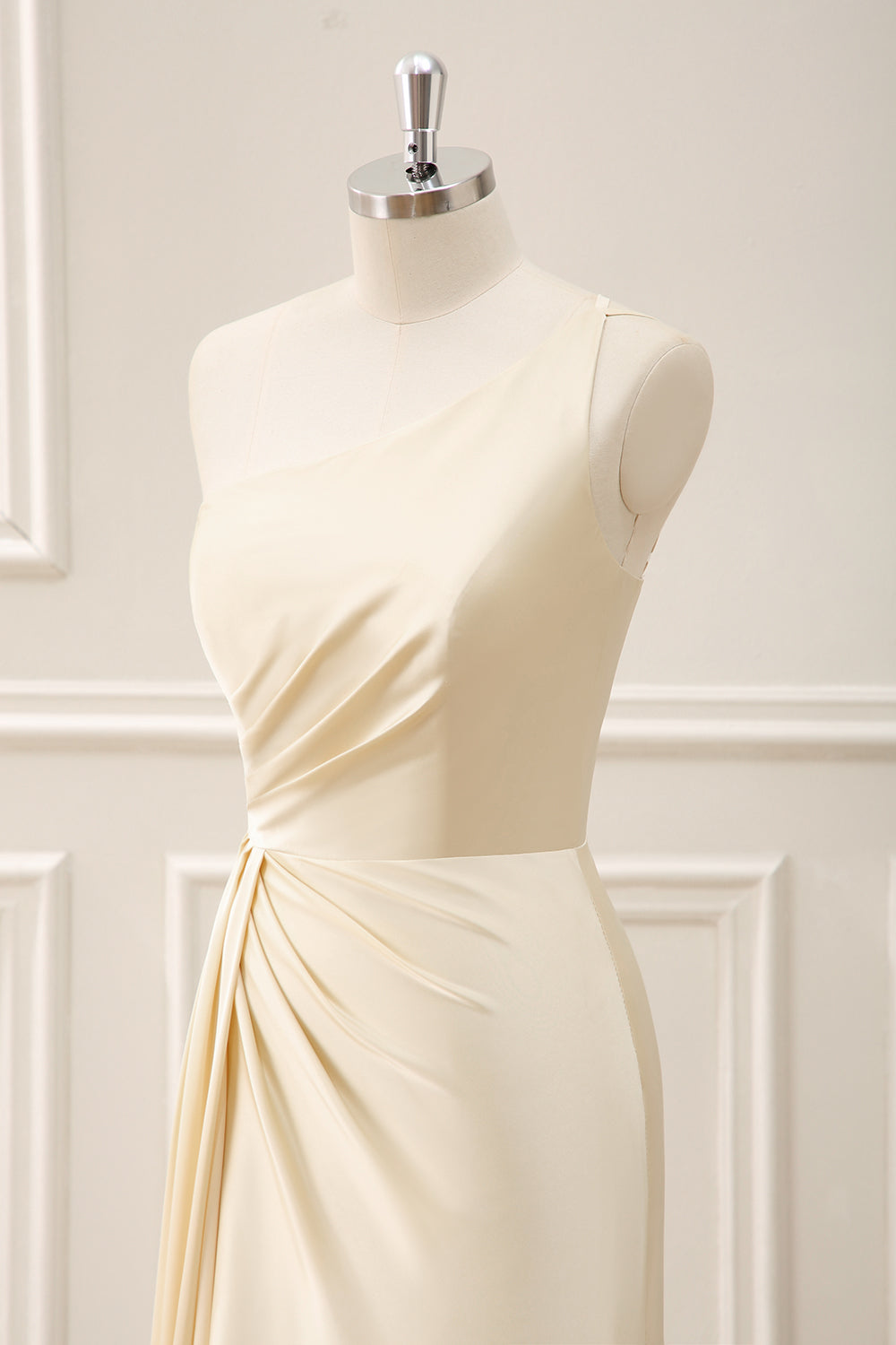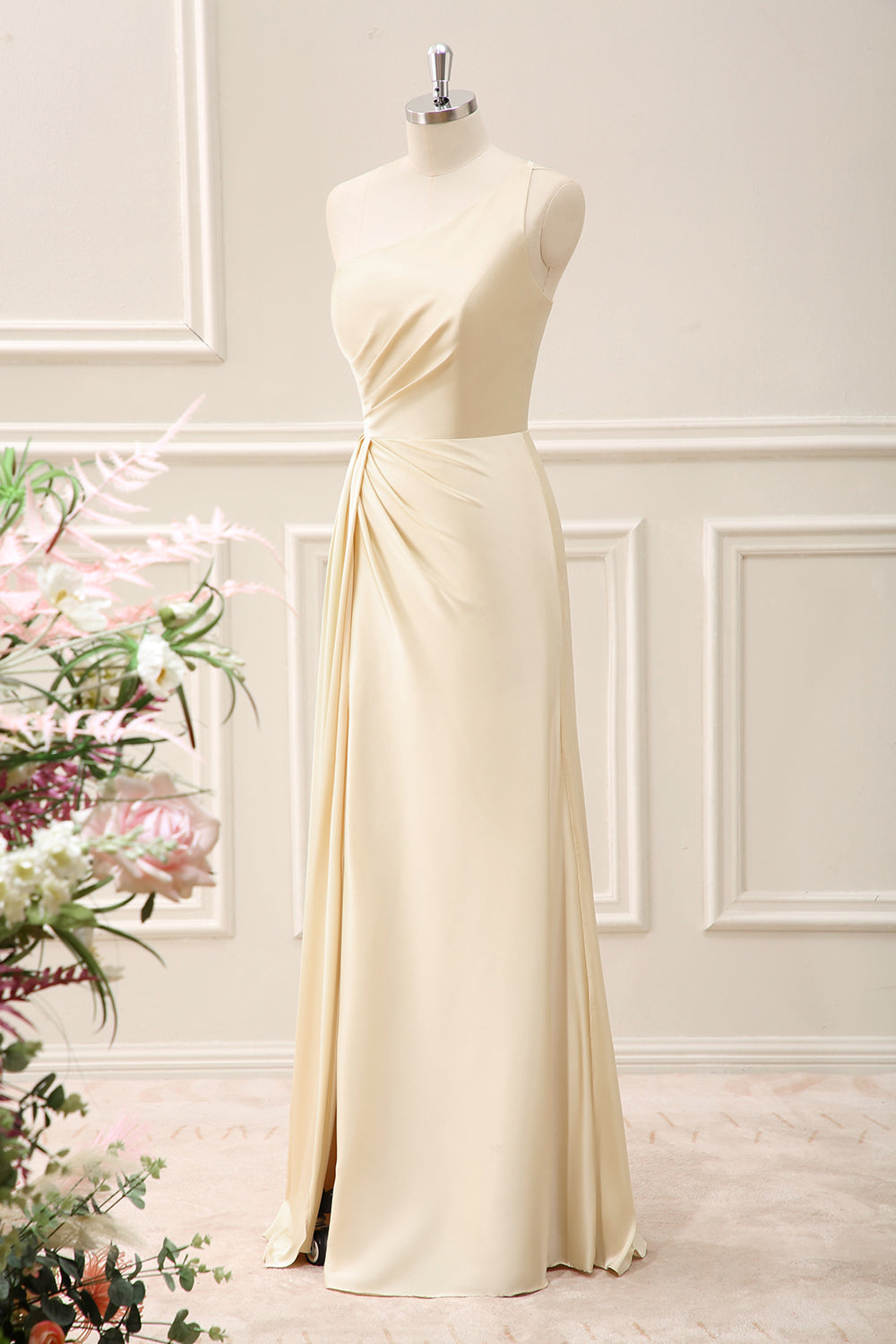 Champagne Sheath One Shoulder Satin Maxi Dress with Slit