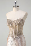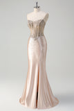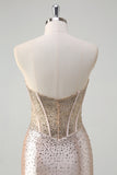Champagne Sweetheart Corset Slit Satin Prom Dress with Beading