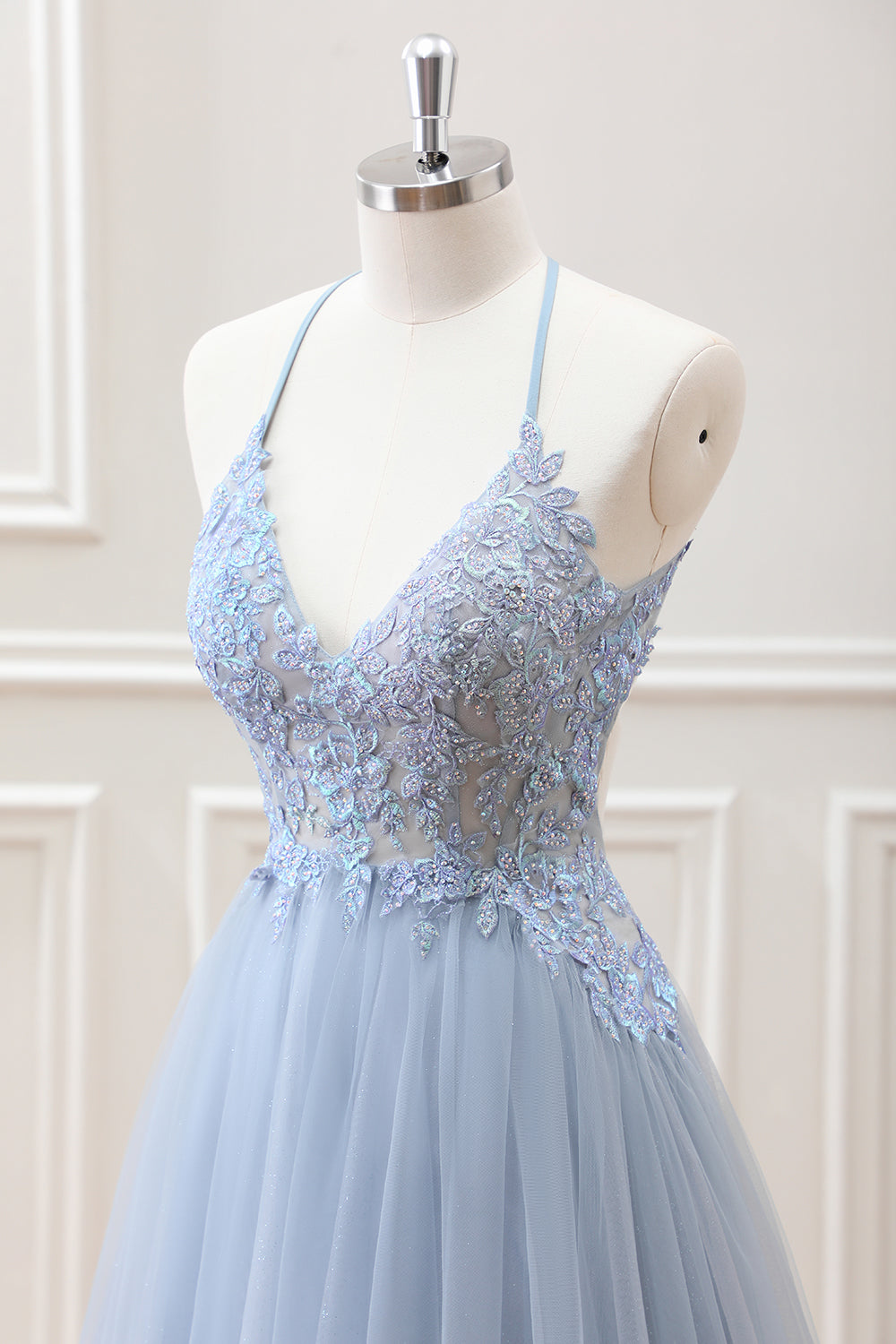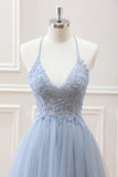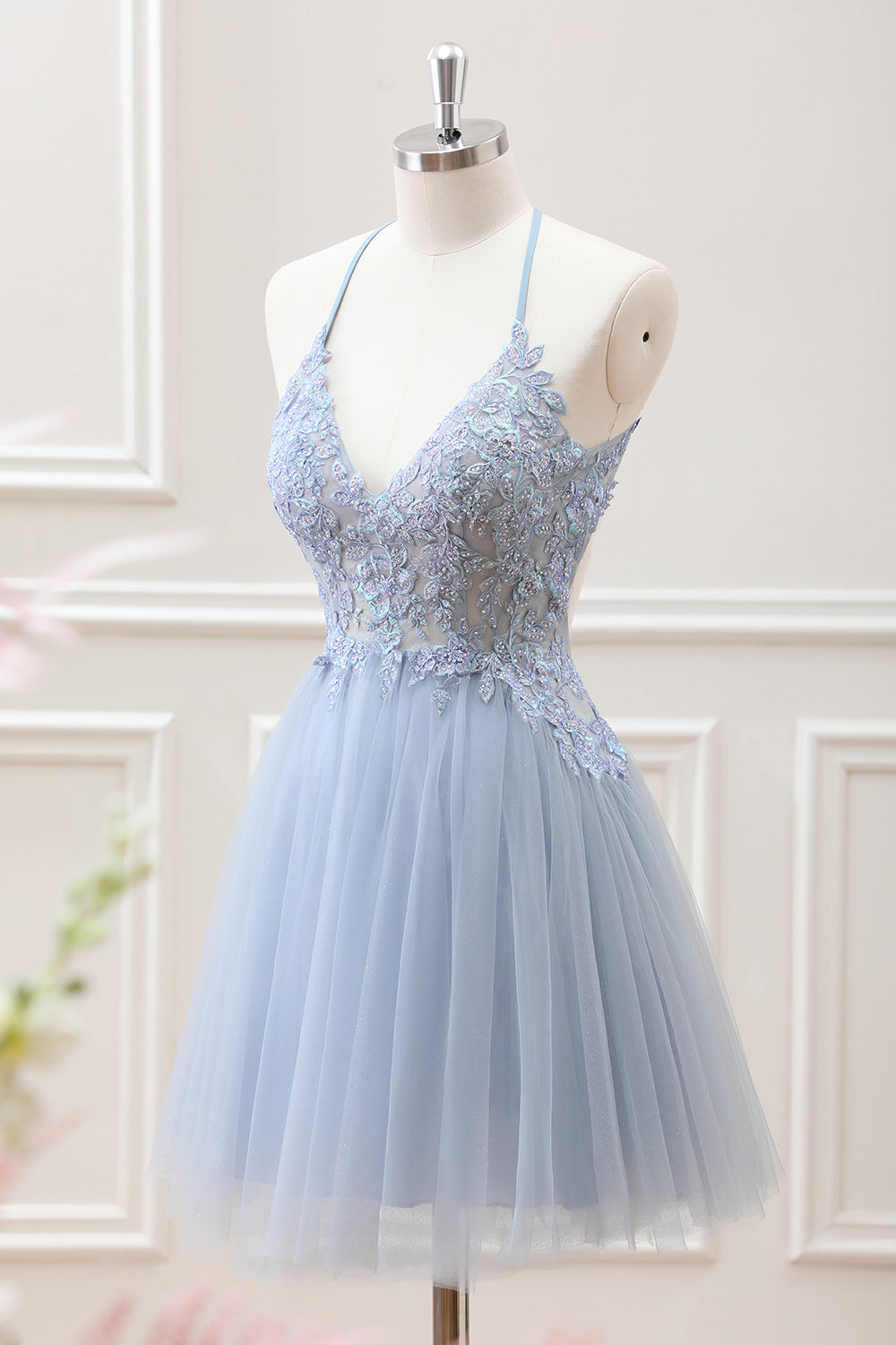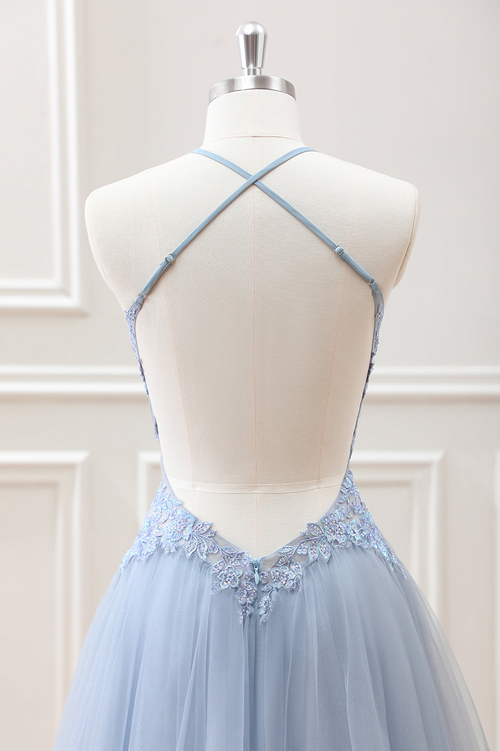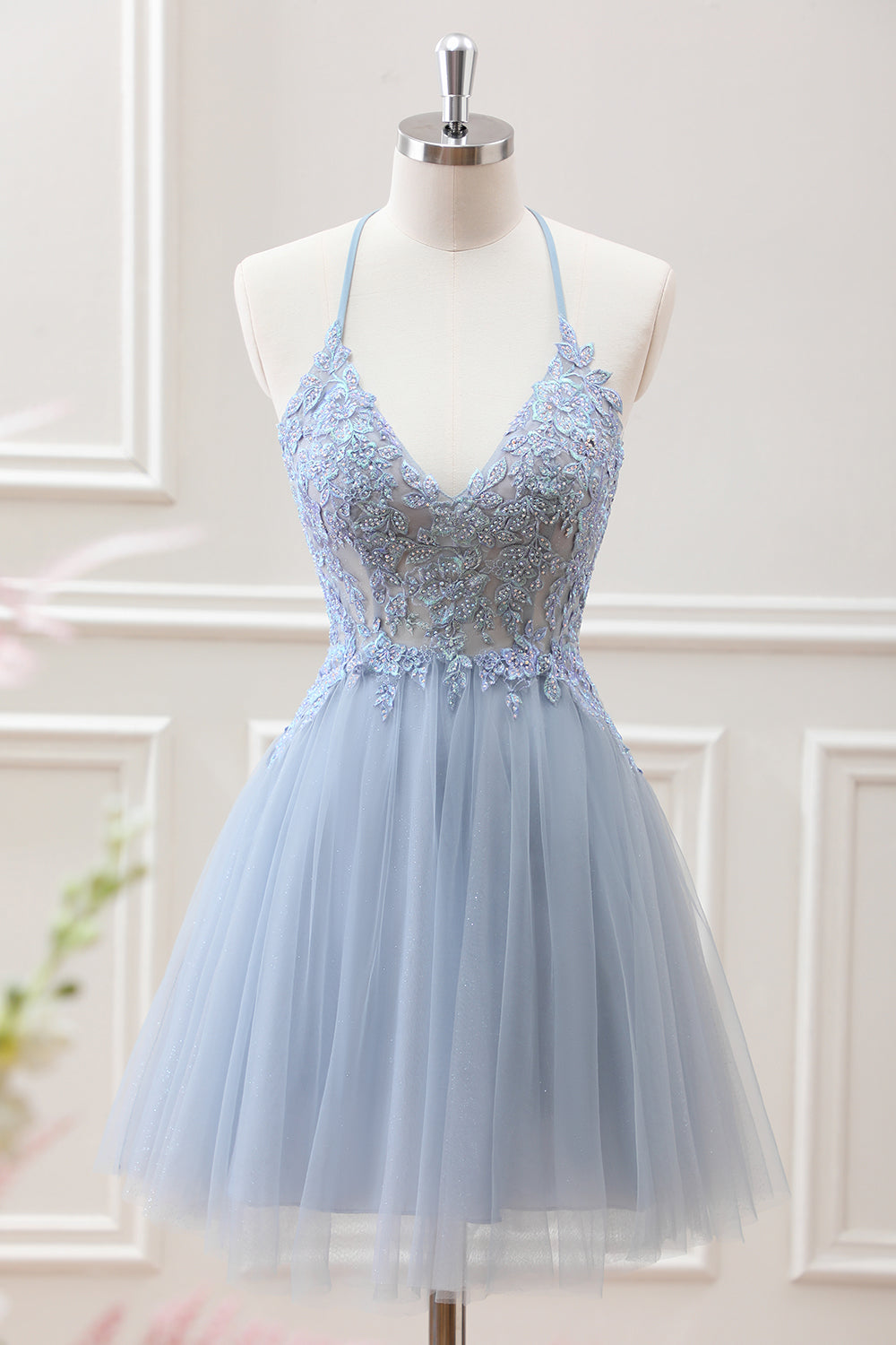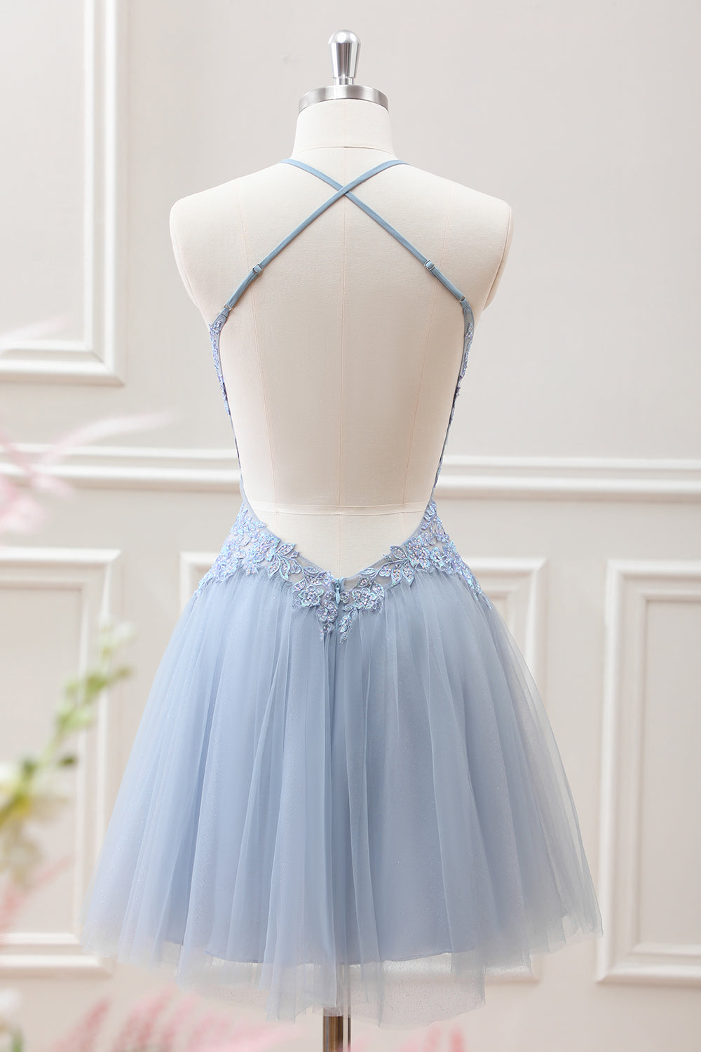 Cute A Line Dusty Blue Backless Tulle Beaded Mini Dress