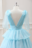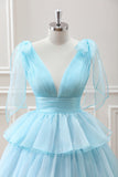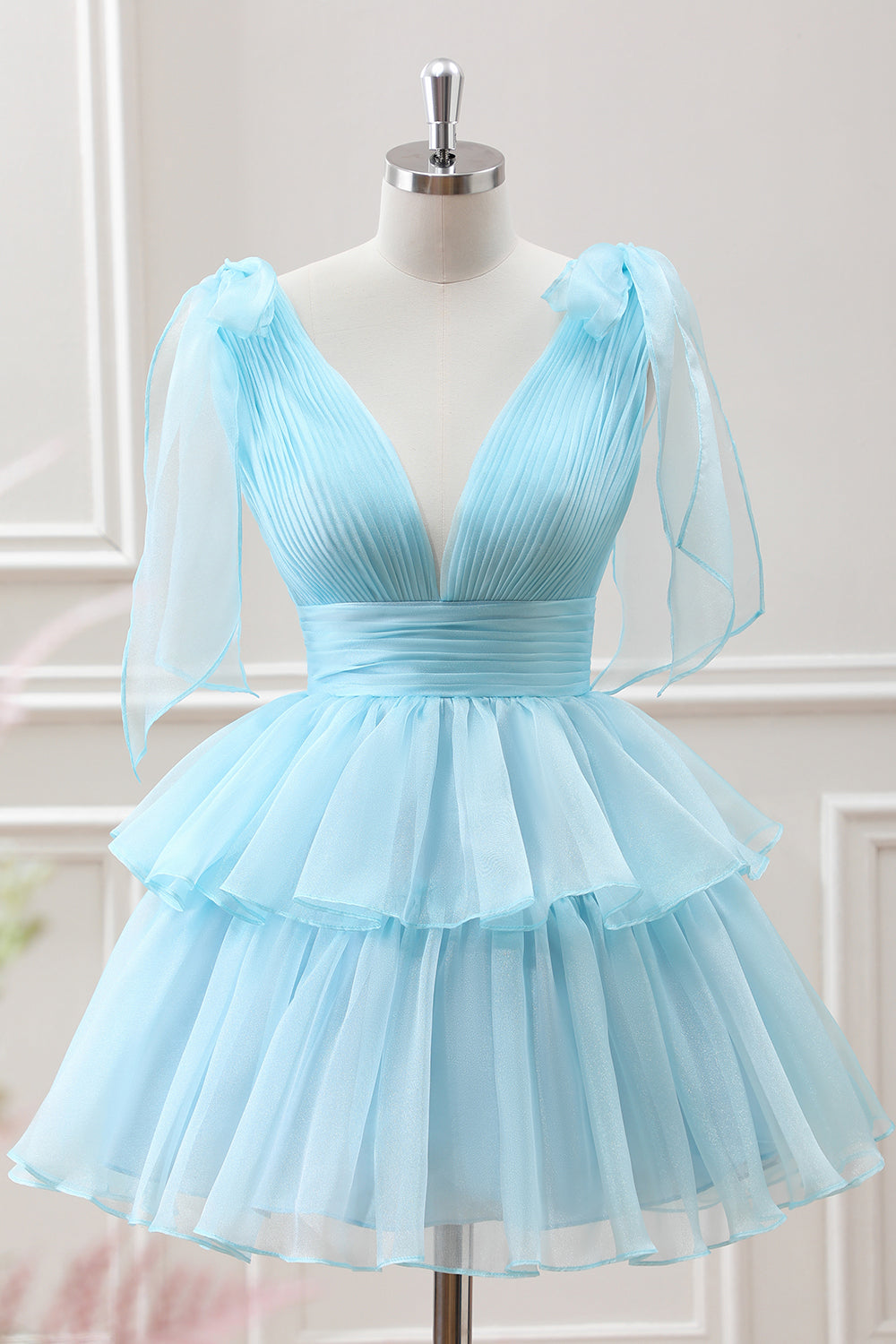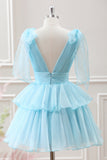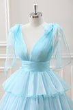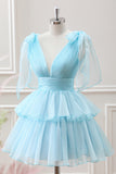 Cute Light Blue A Line V Neck Pleated Tiered Mini Dress