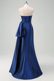 Dark Blue Sweetheart Satin Ruched Mermaid Prom Dress with Slit