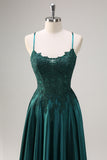 Dark Green Satin A Line Beaded Prom Dress with Appliques
