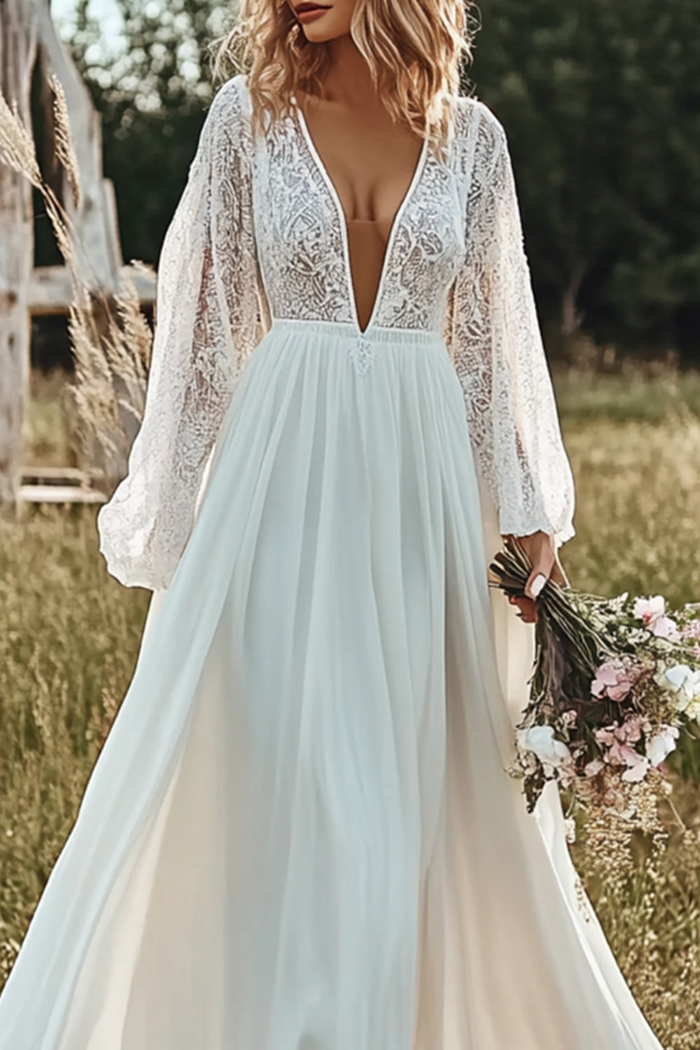 Boho A Line V Neck Illusion Sleeve Ivory Wedding Dress