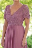 Dusty Rose Chiffon A Line V Neck Lace Mother of the Bride Dress with Short Sleeves