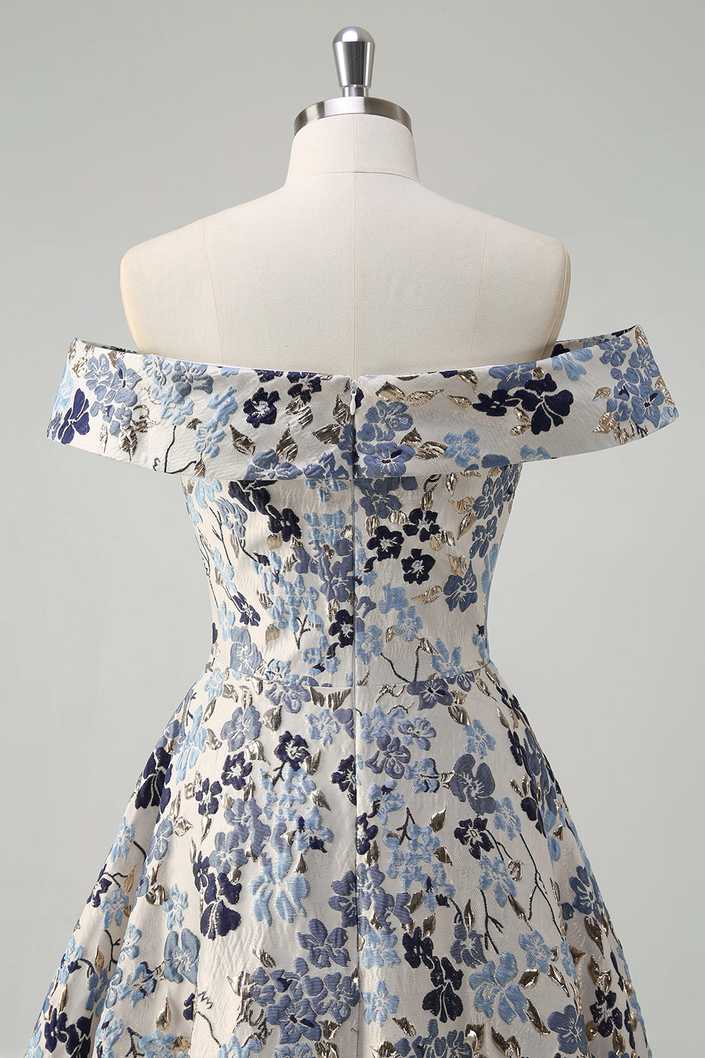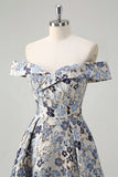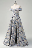 Elegant Blue Flower Pleated Off the Shoulder A Line Prom Dress with Slit
