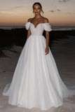 Elegant Ivory Floral Off the Shoulder Tulle A-Line Applique Long Wedding Dress with Slit