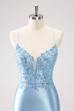 Glitter Blue Appliques Corset Satin Tight Mini Dress with Lace up Back