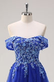 Glitter Royal Blue Off the Shoulder A Line Prom Dress with Beading