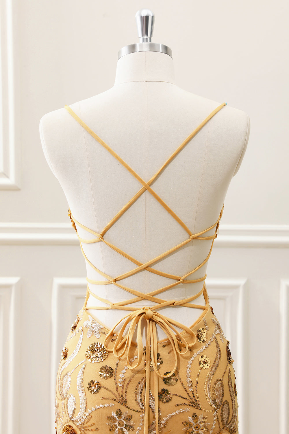 Glitter Yellow Sequined Embroidery Tight Mini Dress with Beading