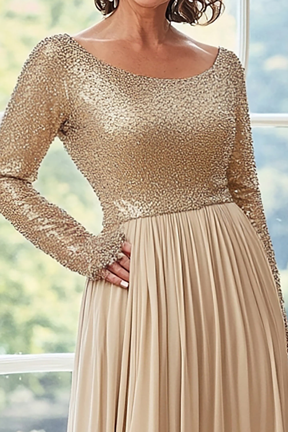 Golden A Line Chiffon Pleated Mother of the Bride Dress with Long Sleeves