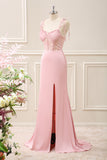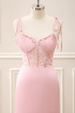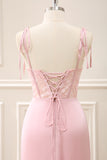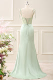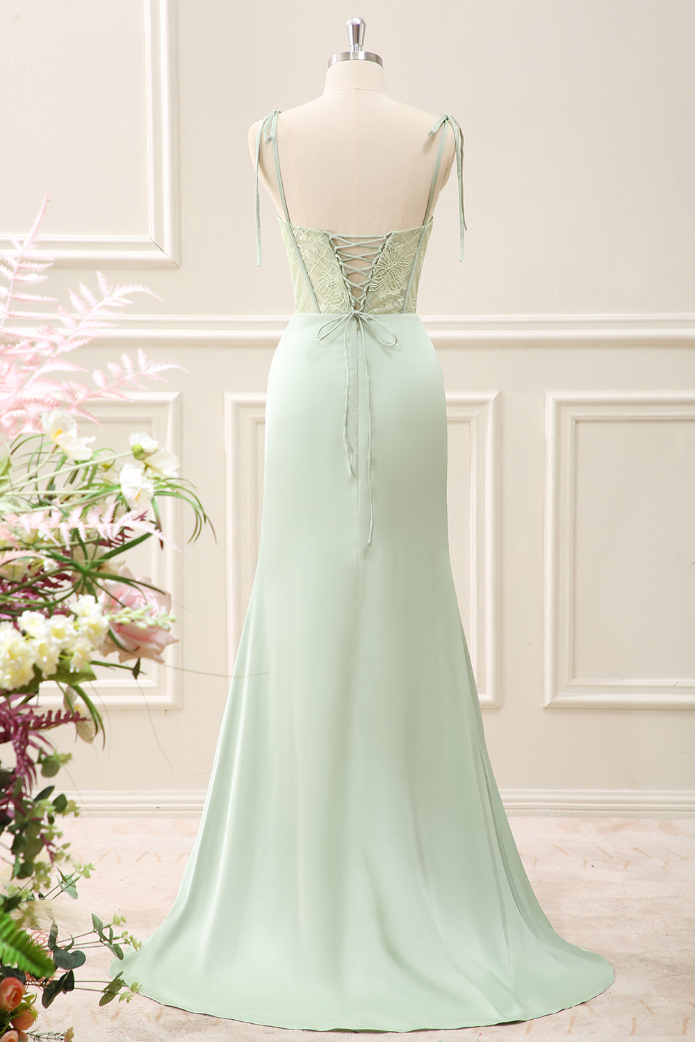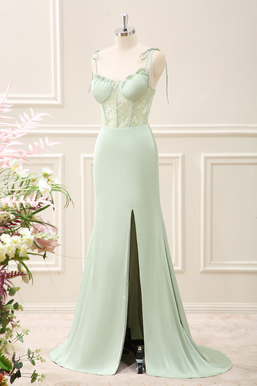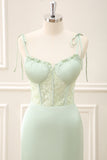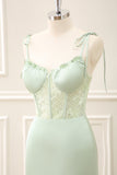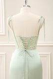 Green Corset Mermaid Embroidered Slit Maxi Dress with Lace up Back