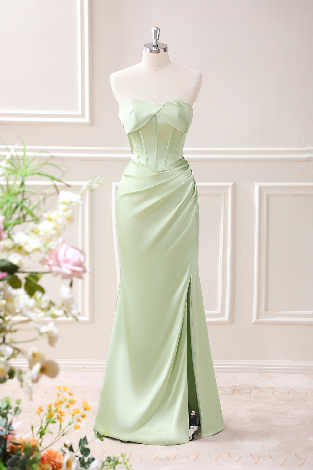 Green Sheath Corset Strapless Maxi Dress with Slit