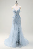 Green Tulle Slit Beaded Floor Length Prom Dress with 3D Appliques