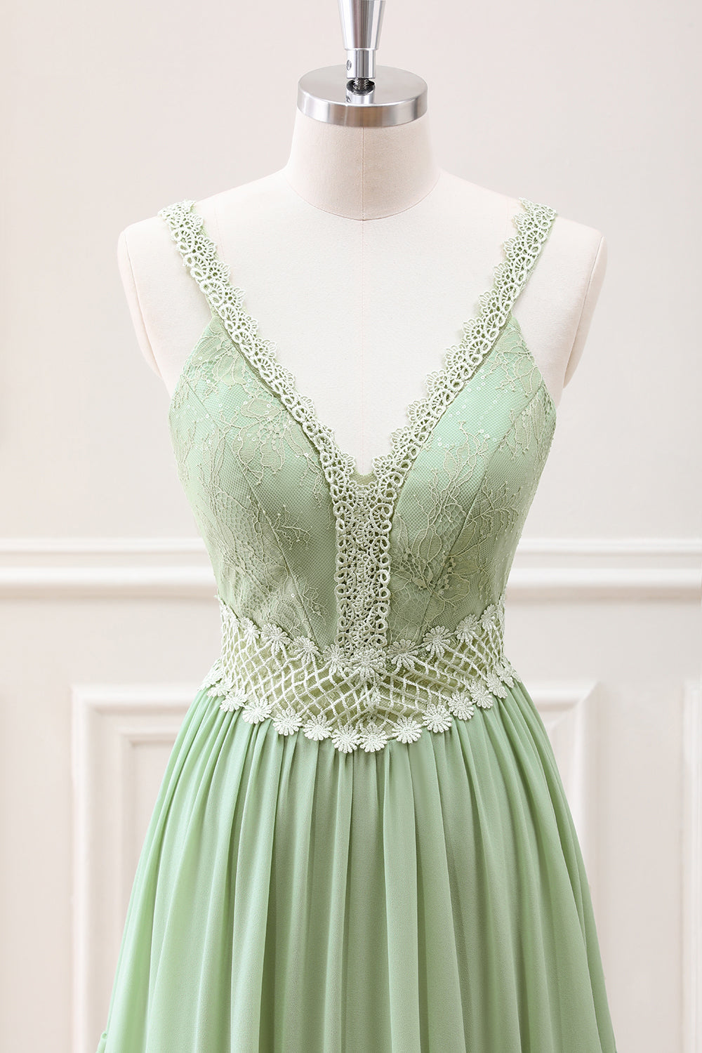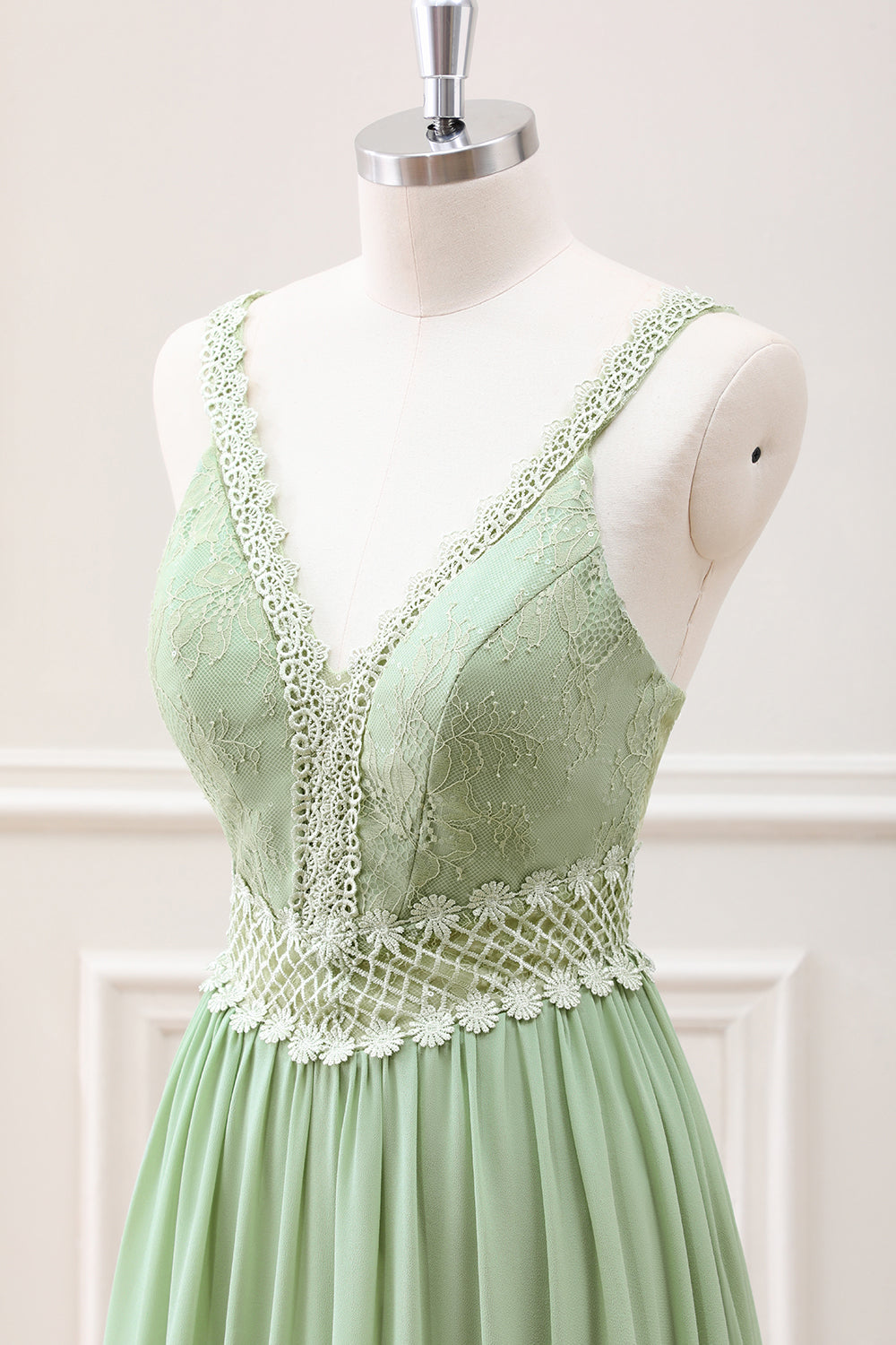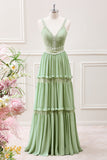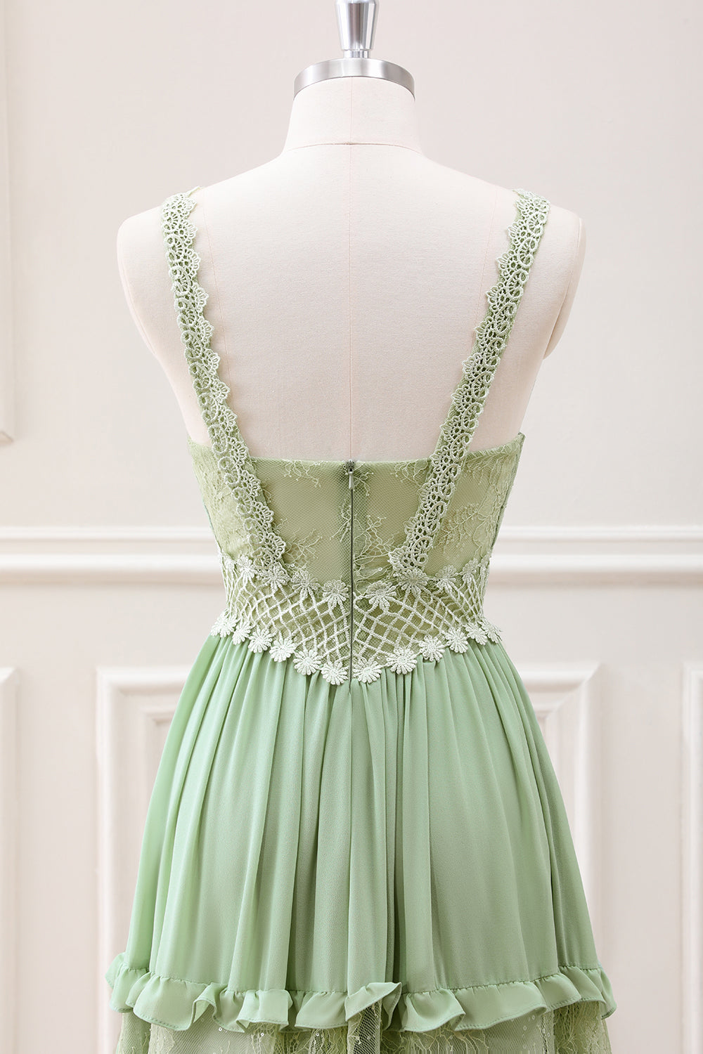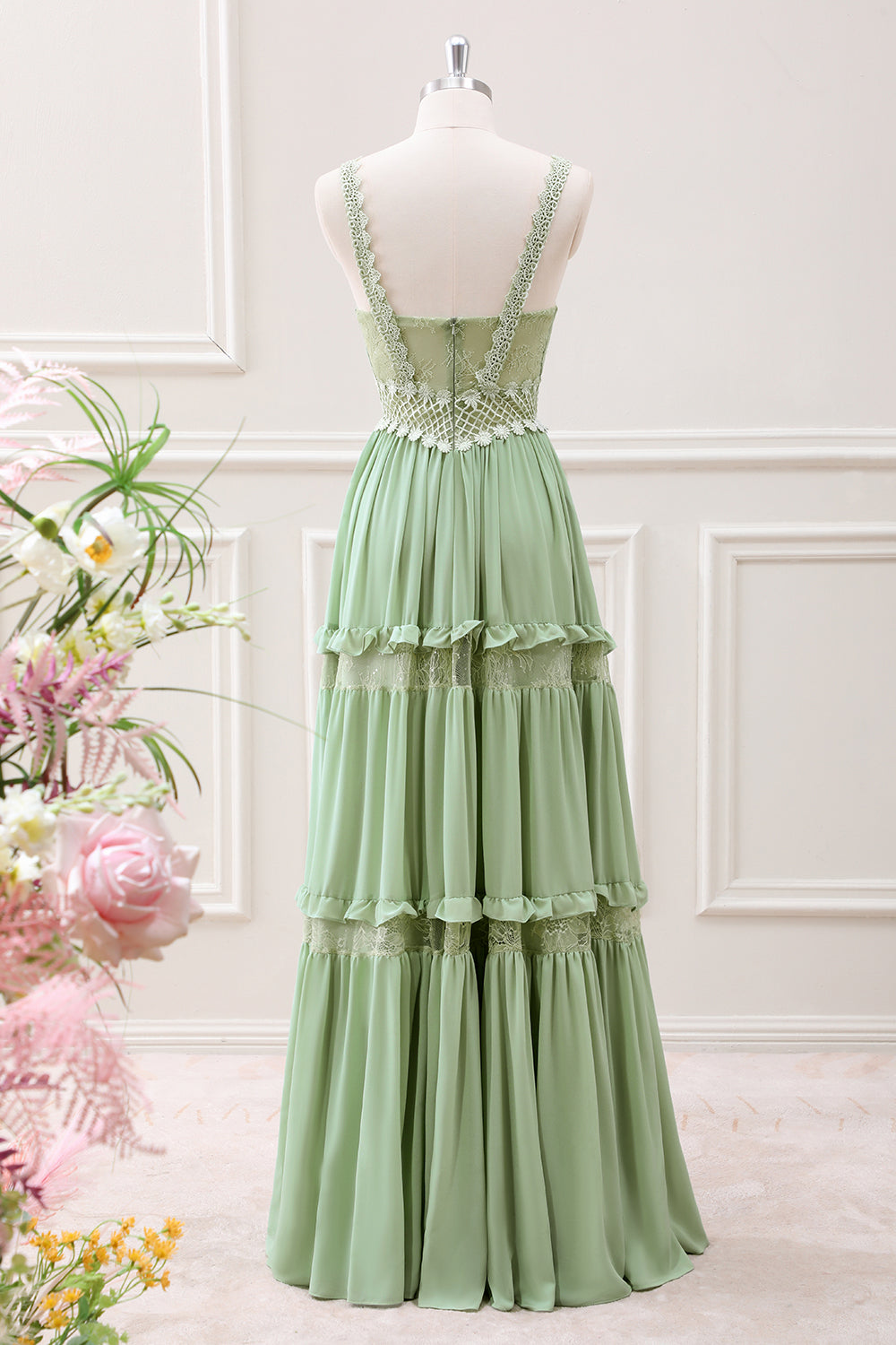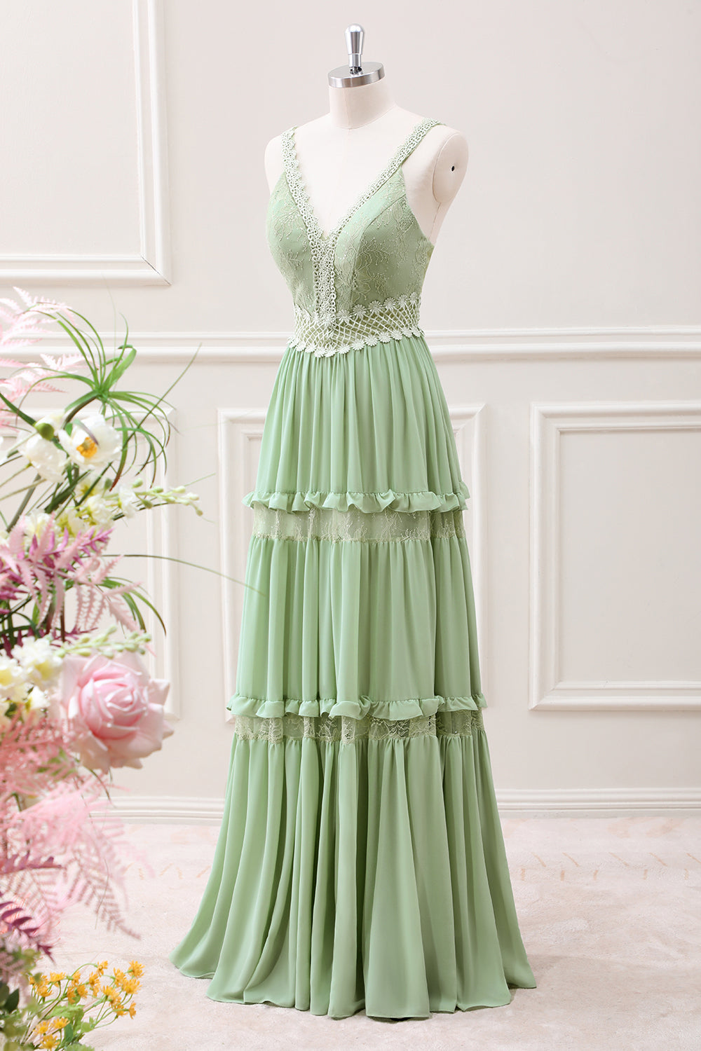 A Line Green V Neck Ruffled Tiered Lace Maxi Dress